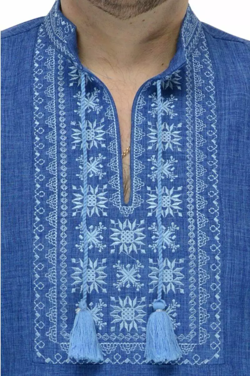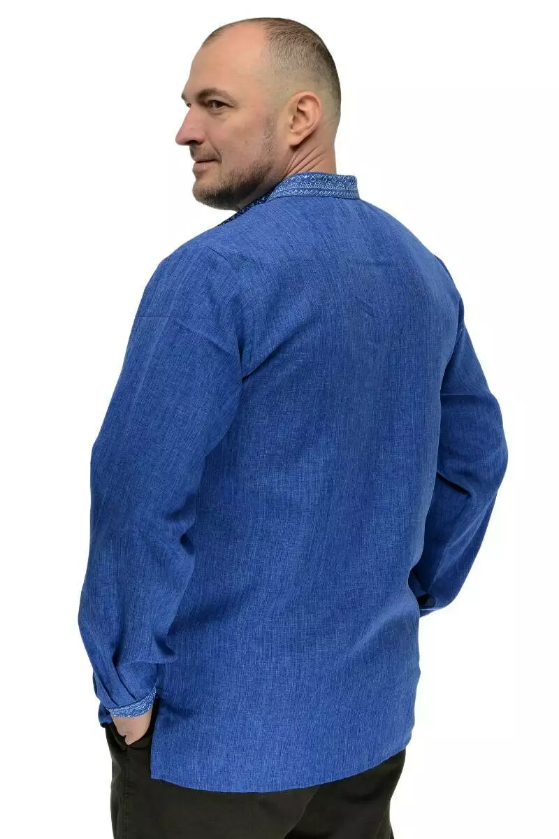 Головною окрасою й одночасно чарівною відмінністю сорочки є вишиті геометричні орнаменти. Білий візерунок довершує елегантний образ і робить виріб ще більш оригінальним. Крій сорочки вільний, рукава на манжетах і застібаються на ґудзик.