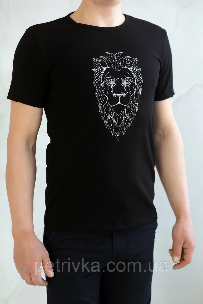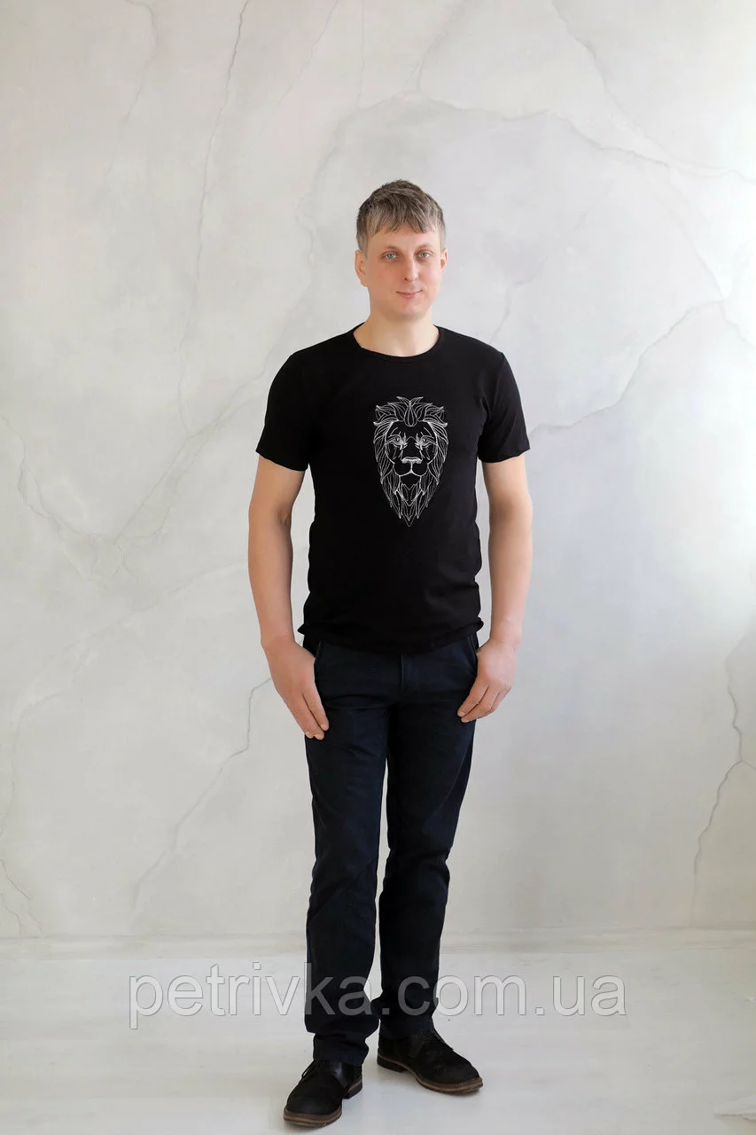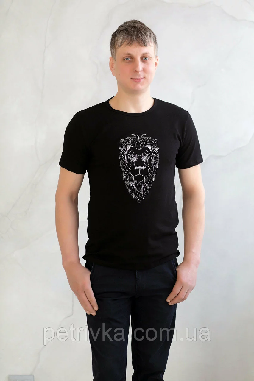 Чоловіча футболка чорна з вишитим принтом Лев, висока якість,