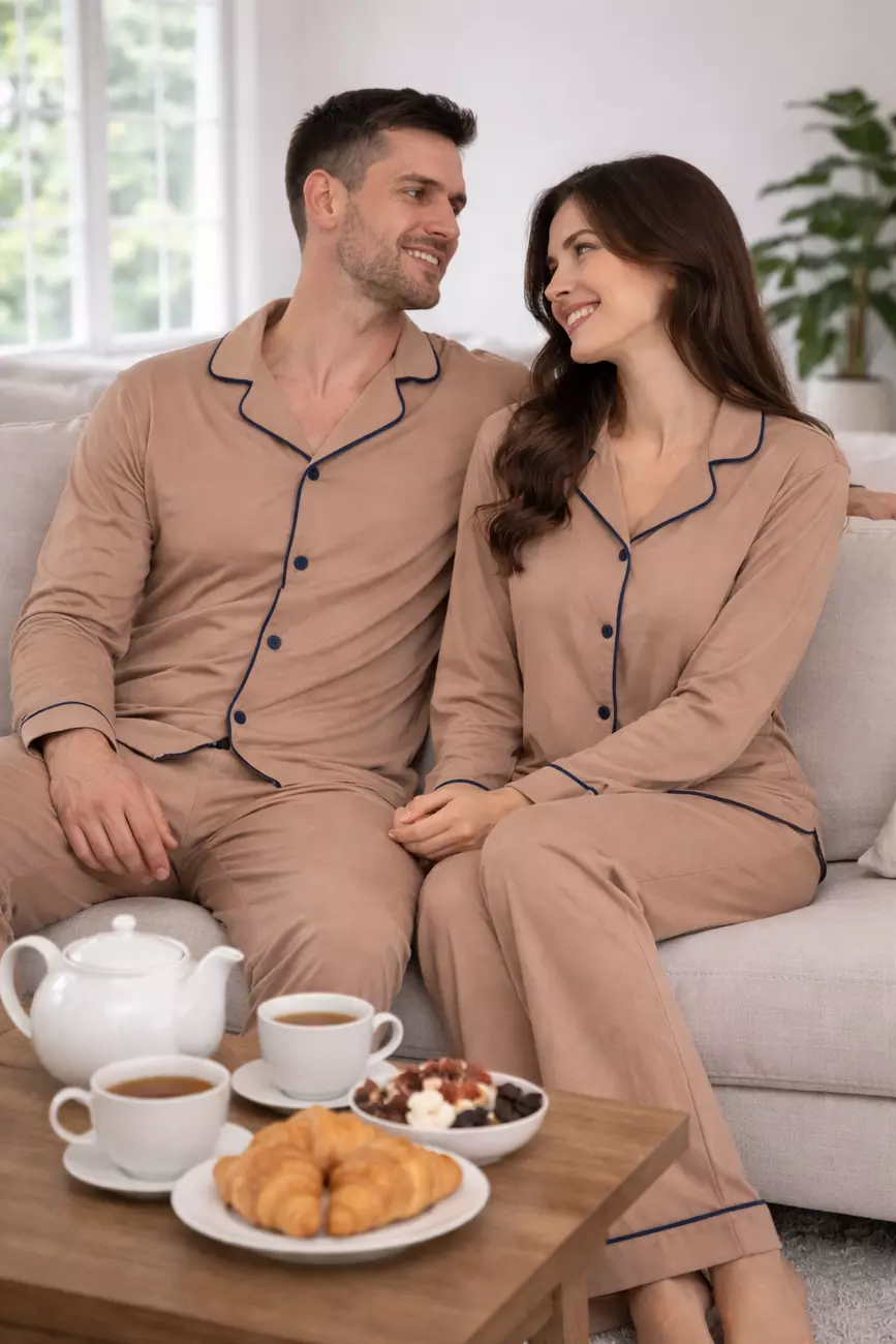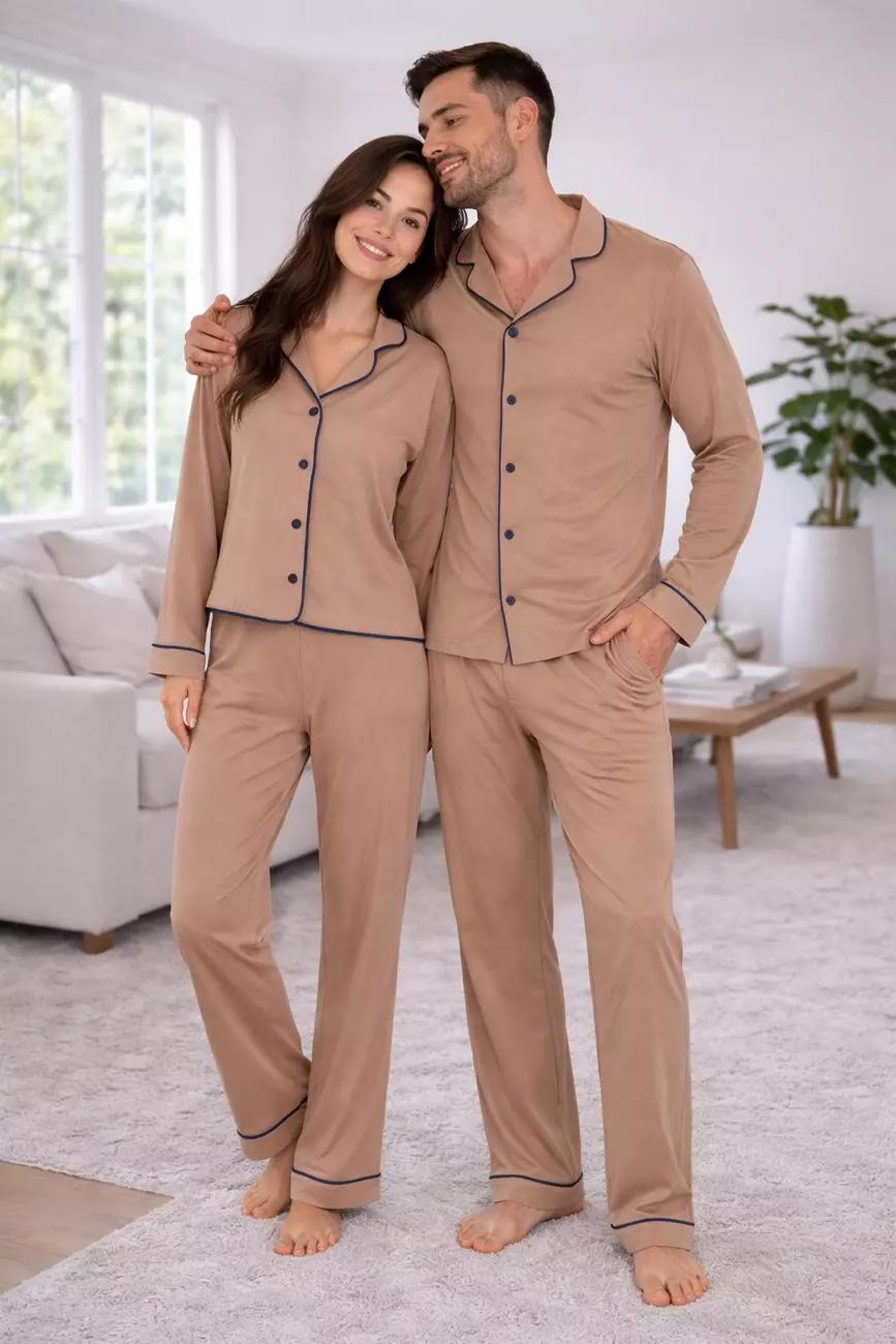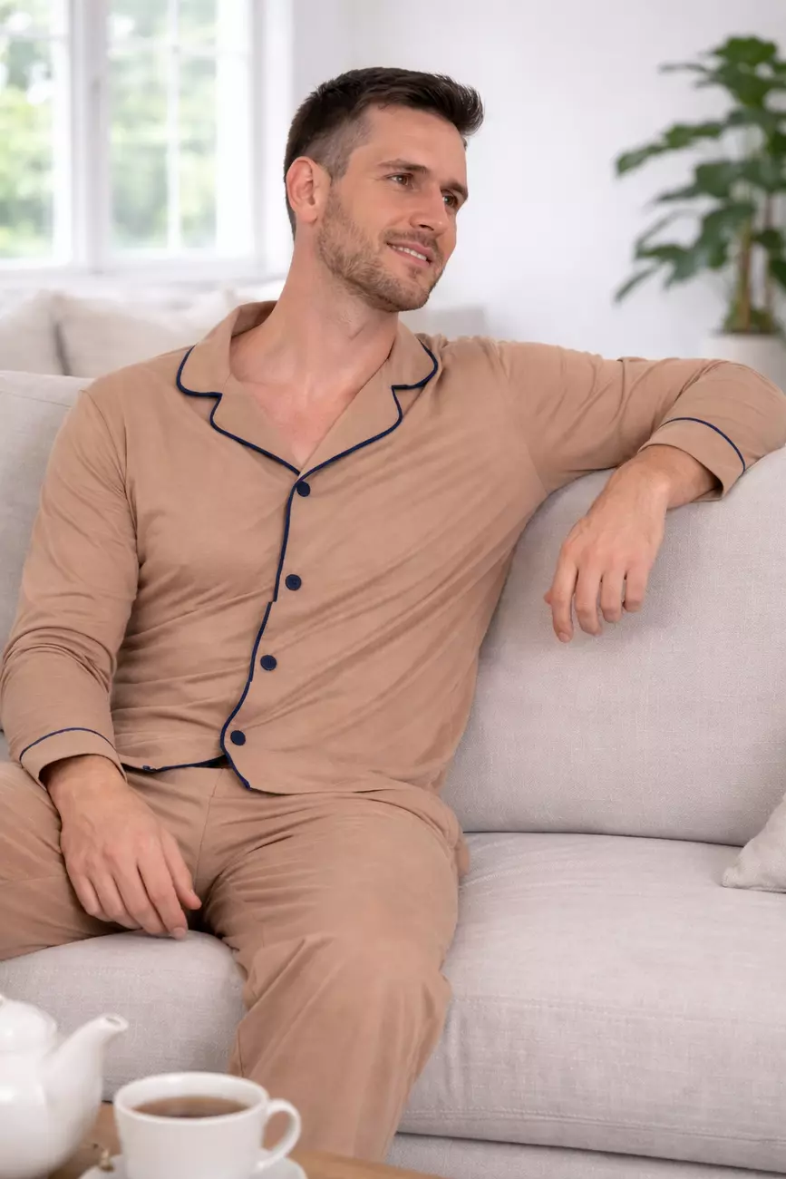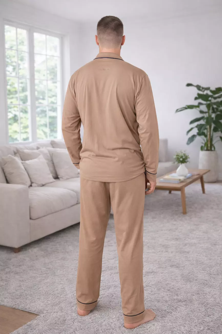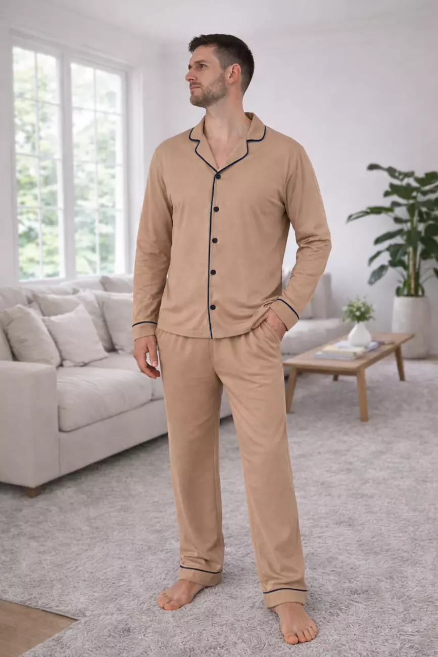 Чоловічий комплект у благородному відтінку Lattе — це вибір тих, хто віддає перевагу спокійним кольорам та витонченому стилю навіть удома. Контрастний темно-синій кант додає образу структурованості та стриманого акценту.