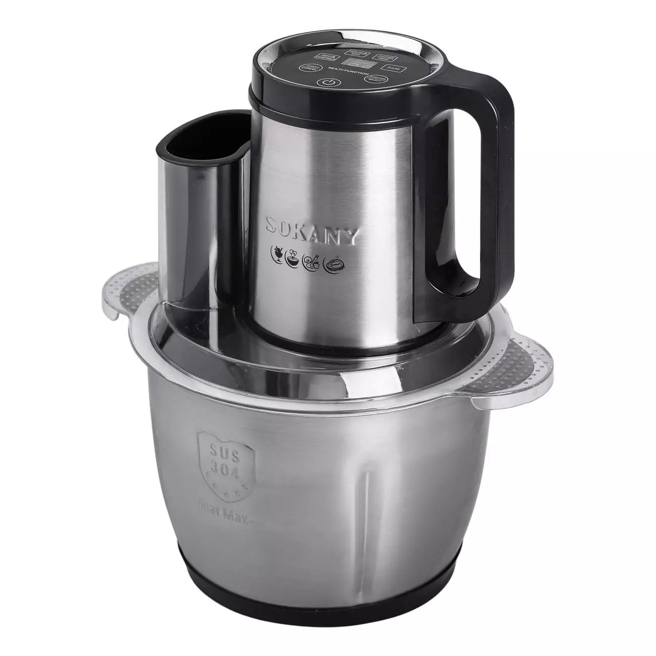 Корпус пристрою виготовлений із комбінації нержавіючої сталі та пластику, що забезпечує його довговічність і стійкість до механічних пошкоджень. Чаша з нержавіючої сталі не вбирає запахи та легко очищується після використання. Sokany SK-06035 оснащений чотирма режимами швидкості, що дозволяє регулювати інтенсивність подрібнення залежно від типу продуктів.
