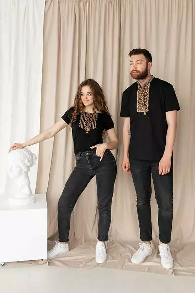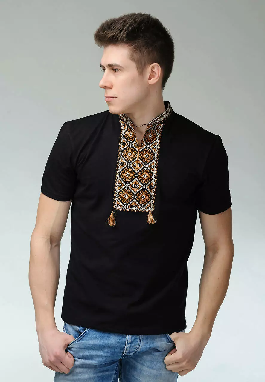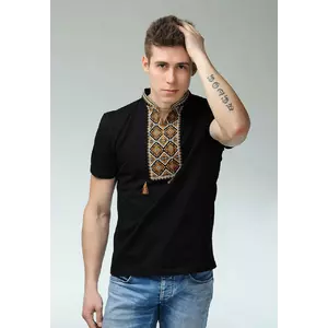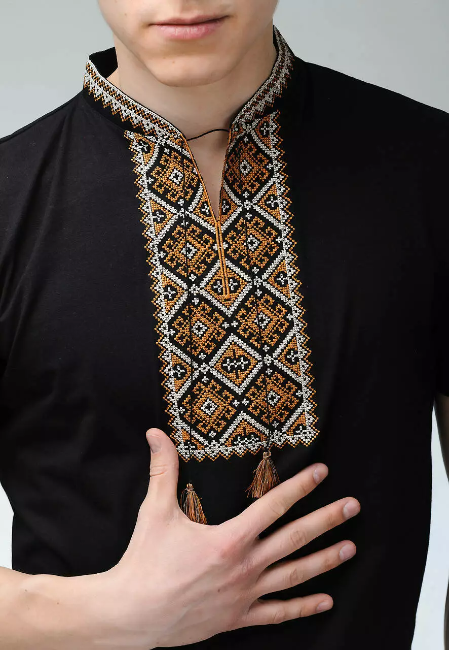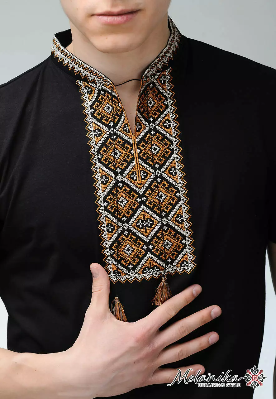 Основна тканина - бавовна чорного кольору, високоякісна та приємна на дотик. Особливої уваги заслуговує неповторний орнамент цієї моделі який виконаний технікою машинної вишивки. Колористи “Меланіки” вирішили поекспериментувати із золотим кольором ниток. Вийшло доволі непогано, адже модель вишитої чоловічої футболки із золотою вишитою стійкою знайшла чимало прихильників серед наших клієнтів. Унікальний орнамент цієї моделі обов’язково зробить ваш образ неперевершеним.