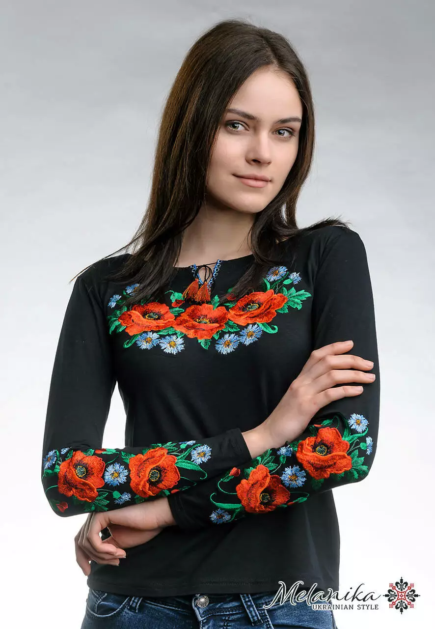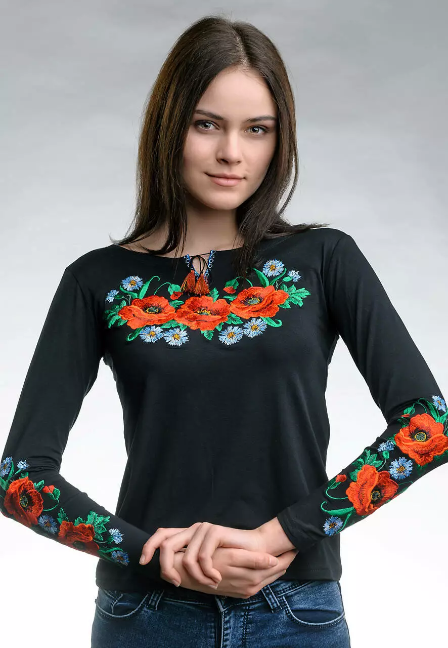 Чорна жіноча вишиванка із віскози миттєво перетворить вас на справжню зірку вечора, а знайомі закидають питаннями де саме ви купили таку модну жіночу вишиванку. Вишиванка чорного кольору прикрашена насиченим квітковим орнаментом на грудях та на рукавах. Оздоблення у вигляді традиційного візерунку із великих маків та волошок. Така вишиванка чудово підійде як на кожен день так і на свята. Одягайте її з джинсами чи шортами під кросівки, кеди чи мокасини - комбінуйте свій образ, як тільки хочете, але будьте впевнені, що він із цією чорною вишитою футболкою буде доречним. Носіть українське разом із нами.