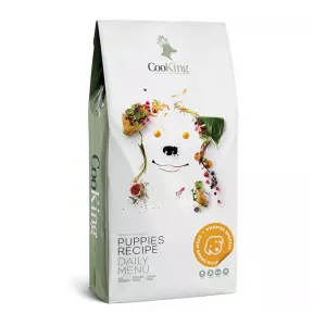 Сухий корм CooKing беззернова формула з свіжим м'ясом для цуценят Повнораціонний збалансований беззерновий сухий корм для цуценят виготовлений на основі свіжого курячого м’яса. Поживний, легкозасвоюваний раціон, що забезпечить тварину всіма необхідними поживними речовинами для здорового росту та розвитку. Склад: Свіже куряче м'ясо (мінімум 20%), картопля, бобові, жир домашньої птиці, пивні дріжджі, тунець, гідролізована куряча печінка, риб’ячий жир, овочі (цикорій, морква, зелена квасоля, кольрабі), мінеральні речовини, екстракт Юкки Шидігера, яблучна клітковина, хондропротекторний комплекс (глюкозамін гідрохлорид, хондроїтин сульфат, екстракт зелених мідій (Perna canaliculus)), манно-олігосахариди, фрукто-олігосахариди, таурин, рослини (календула, шавлія, пажитник, кріп, чебрець), пребіотики, екстракти (червоних плодів, цитрусових, насіння розторопші, насіння зеленого чаю, м'яти, розмарину), натуральні антиоксиданти, живі пробіотики (E. faecium). Аналітичний склад: Сирий білок: 30 % Сирий жир: 17 % Сира клітковина: 2 % Зола: 7 % Кальцій: 1,3 % Фосфор: 1,1 % Омега 3: 0,46 % Омега 6: 1,79 % Хондроїтин: 870 мг/кг Глюкозамін: 1,380 мг/кг Амінокислоти: Таурин: 850 мг/кг