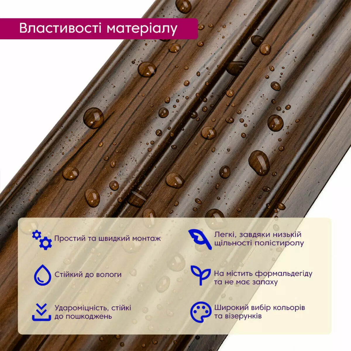 - Фактура: поверхня рівна або структурна, імітує