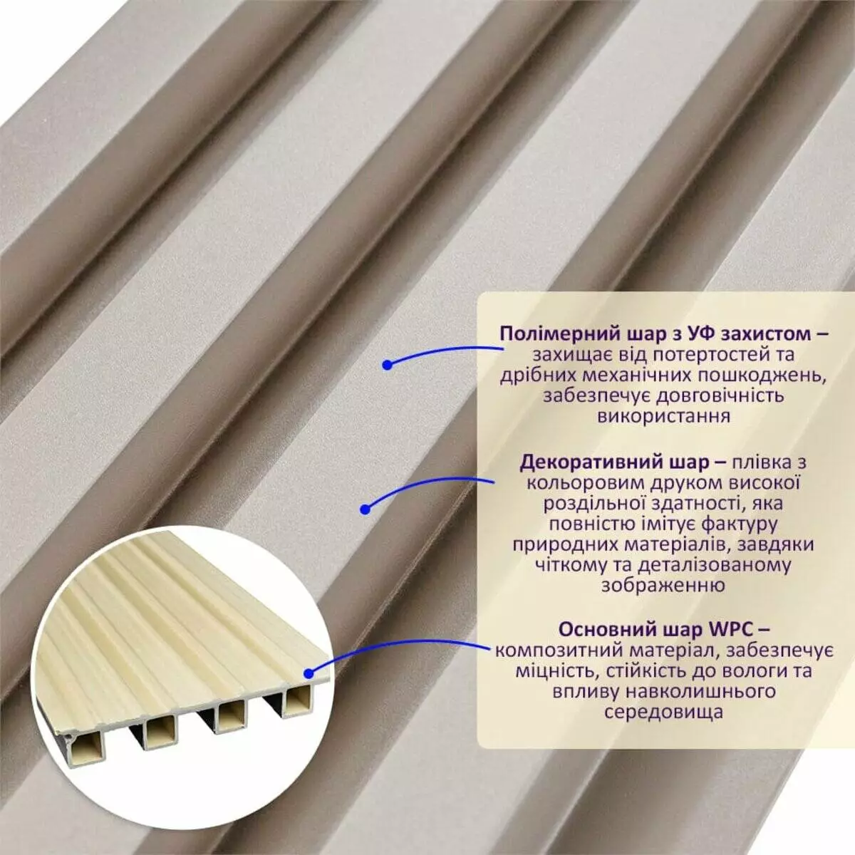 • Стійкість до впливу ультрафіолету: стінові панелі WPC зберігають свій колір та структуру під впливом ультрафіолетового випромінювання.