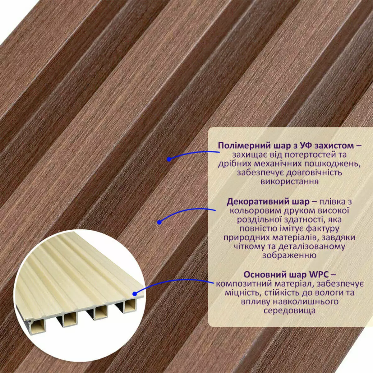 Опис: Стінові рейки WPC – будівельний матеріал для внутрішнього оздоблення, що імітує натуральну деревину.