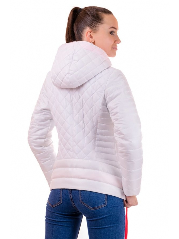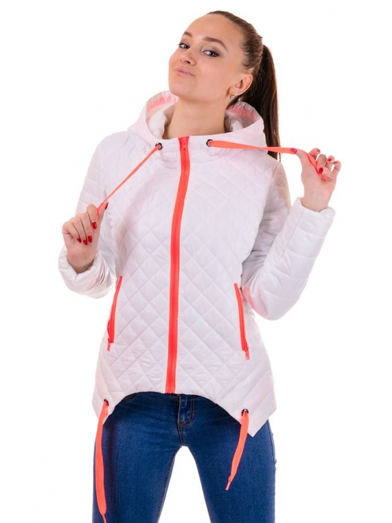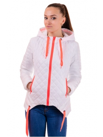 Яркая весенняя куртка с контрастной отделкой! Застегивается на молнию типа "трактор". По бокам два кармана, с декоративной змейкой в цвет отделки. Капюшон не съемный, затягивается на котрасный шнурок. Низ куртки также украшен шнурком, продетым в холитены. Ткань - плащевка лаке, утеплитель - синтепон(плотность 120). Длина изделия 62-64 см.