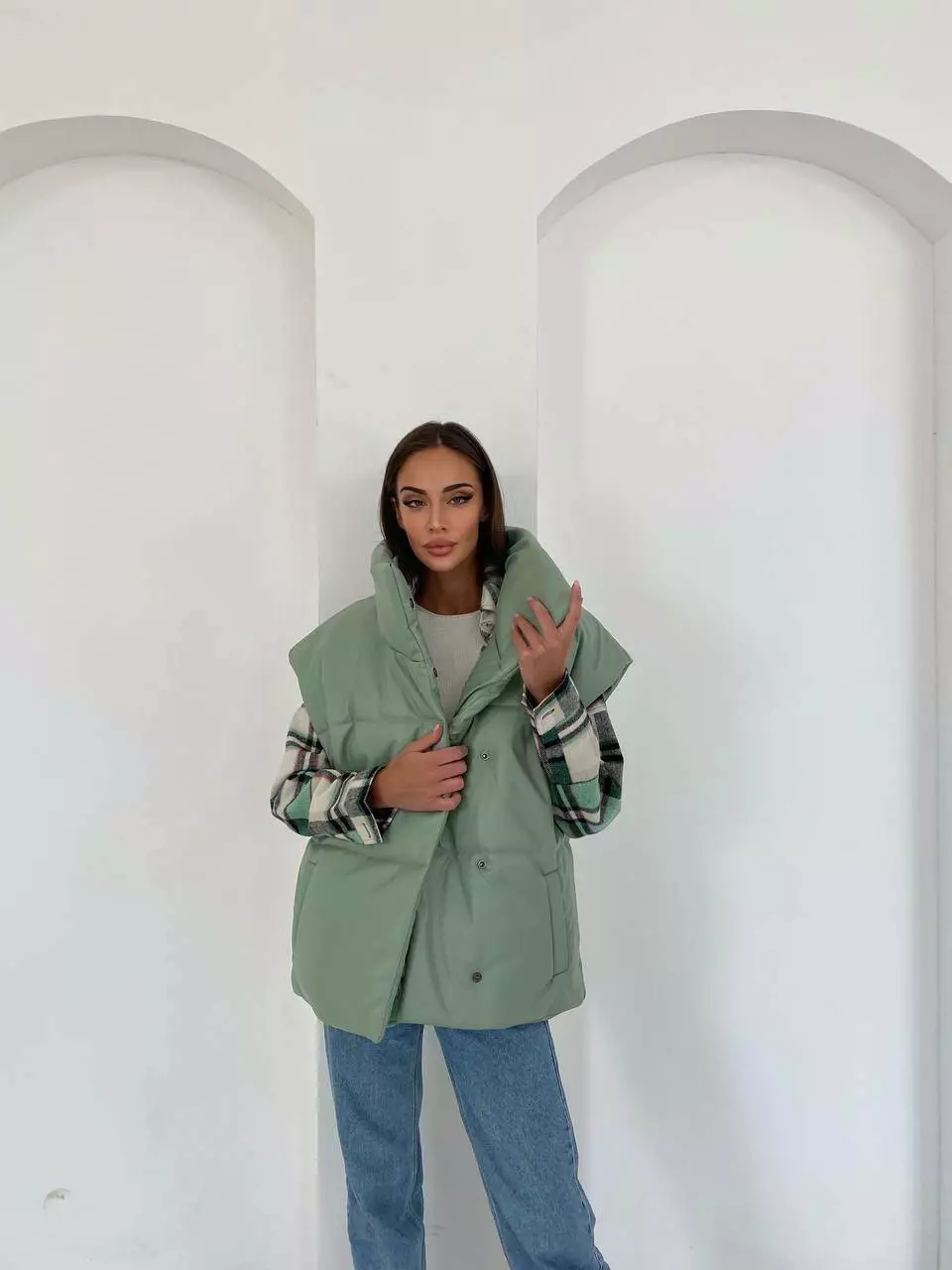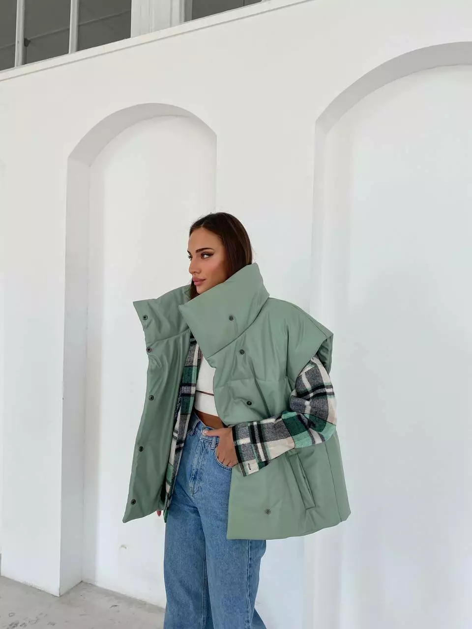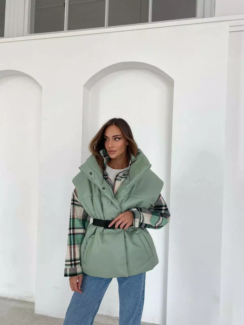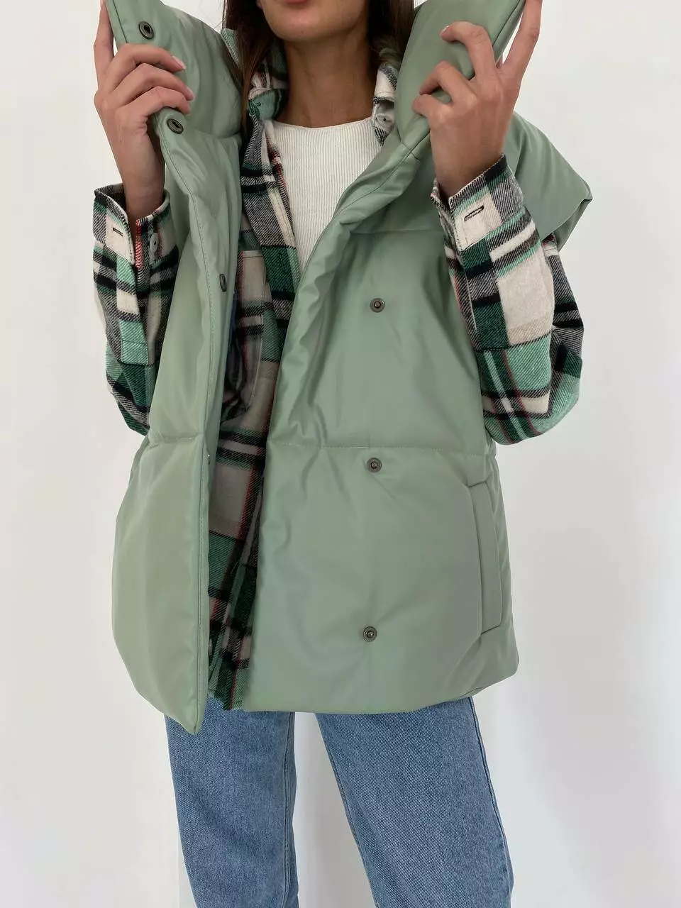 Демісезонний трендовий жилет з екошкіри внесе різноманітність у повсякденний образ восени та навесні.