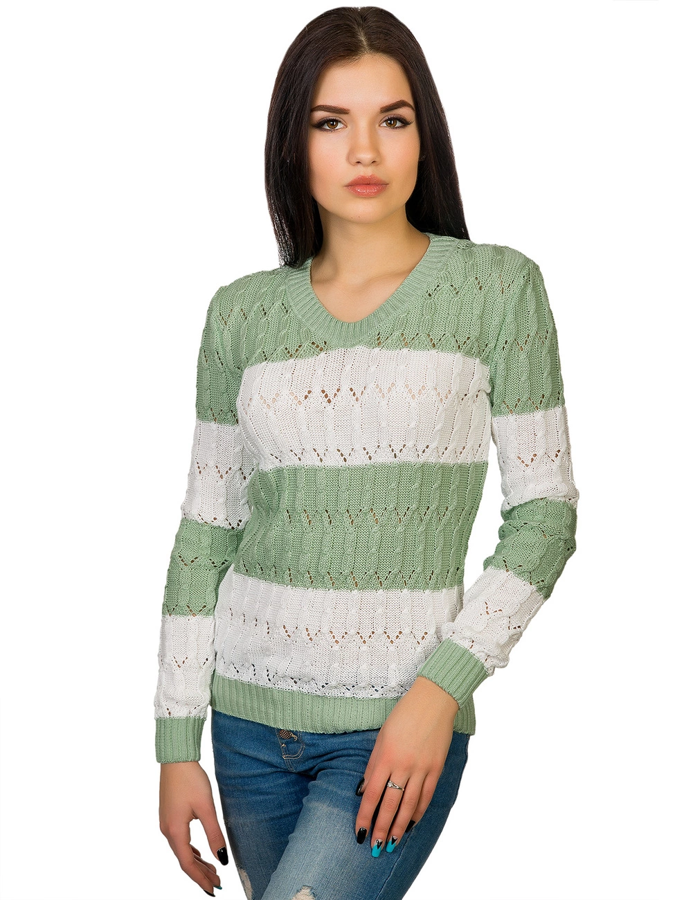 Горловина выполнена овальным вырезом. Рукава и низ изделия
