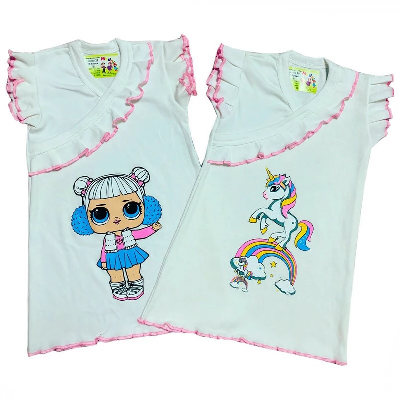 Ночная сорочка для девочки Милена. Материал: интерлок - износостойкий, легкий, мягкий, гигроскопичный, гипоаллергенный. В наличии рисунки Лол, Барби и единорог. Рисунок- шелкография. Украшают сорочку опикованные рюши. Сорочка чудесно подойдет для тёплых летних ночей.