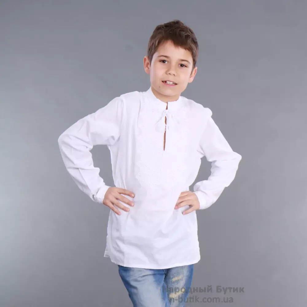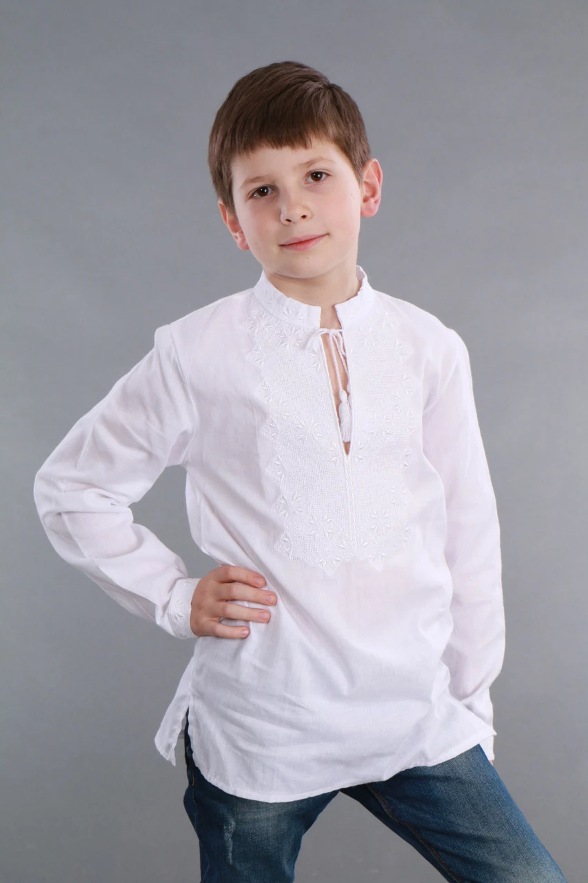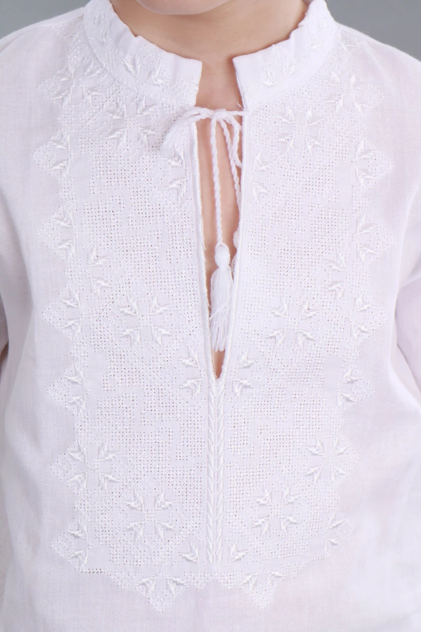 Белая детская вышиванка для мальчика с длинным рукавом вышита