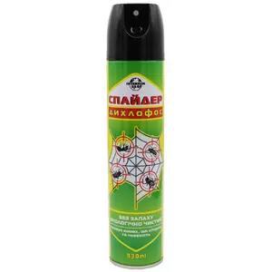 Дихлофос Спайдер без запаха спрей 330мл - применяется в бытовых условиях, позволит быстро и надолго избавиться от всех видов ползающих и летающих вредных насекомых: мух, комаров, тараканов, муравьёв, бабочек моли, клопов, блох и др. Преимущества: - Средство не имеет запаха. - Эффективно уничтожает большинство видов вредных насекомых. - Наличие современной формулы из трёх действующих веществ, усиленное специальным веществом-синергистом. - Создаёт защитный барьер на обработанных поверхностях, действует до 2-х недель. Применение: Упаковку объемом 190 мл применяют на площадь не менее 28 м2. При обработке балон держать на расстоянии 20 см от обрабатываемой поверхности. Обработку проводить при закрытых окнах и дверях. Для обработки помещения площадью 20-30кв.м достаточно распылять аэрозоль в течении 4-5 секунд. Перед распылением необходимо накрыть всю посуду и убрать продукты, чтобы на них не попали действующие вещества из аэрозоля. Уничтожение насекомых: - Для мух, комаров и москитов: струю аэрозоля направлять в воздух или в места скопления насекомых. Обрабатывают места посадки мух, направив струю на стекла окон, рамы, косяки дверей. - Для бабочек моли в шкафах: распылять средство из расчета на 1 м.куб 1-2 сек, обработку проводить при закрытых окнах. - Для тараканов и постельных клопов: струю аэрозоля направляют непосредственно на скопления насекомых или на места их обитания. Обработке подлежат щели вдоль плинтусов и прилегающим к ним участков стен и пола, вдоль труб водопроводной и канализационной систем, щели за дверными коробами, вокруг раковин, кровати, диваны, места отхождения обоев, щели в стенах. Обратная сторона картин, ковров. - Для блох: справится на 100% если обработать щели за плинтусами и стены на высоту 1м, подстилки животных, которые перед использованием должны быть выстираны. - Для муравьев: обрабатывают места передвижения насекомых (дорожки). Меры предосторожности: При попадании распыленного аэрозоля в воздух растворитель из него мгновенно улетучивается, а инсектицид в виде мельчайших капель остается в воздухе, уничтожая всех насекомых в помещении. Через 15 минут после распыления аэрозоля нужно тщательно проветрить помещение, предварительно занавесив окна и двери, во избежание проникновения в него новых насекомых.