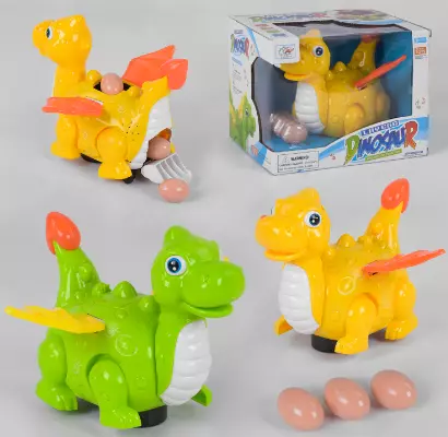 Дитяча машинка в формі динозавра, обов'язково розважить Вашого малюка своїм яскравим зовнішнім виглядом і цікавим функціоналом. Динозаврик виготовлений з первинної пластмаси, всі деталі заокруглені і виглядають дуже мультяшно. Іграшка дуже деталізована і опрацьована в дрібницях. Все тіло рептилії покрито об'ємними, круглими лусочками, шия рельєфна, а мордочка прикрашена вставними очима. У іграшки рухаються: лапки, крила і шия. Головна особливість динозавра - це висиджувати яйця. На корпусі є невеликий відсік, в який необхідно їх помістити. Коли Ви активуєте іграшку, і вона почне ходити, то в якийсь момент динозаврик зупинитися і відкладе яйце. Ефекти іграшки: - співає пісеньку; - ходить; - рухає крилами, лапками і головою; - очі, хвіст і крила світяться: червоним, жовтим і синім світлом; - висиджує яйце; - під підборіддям є невеликий проектор, який показує зображення динозавра. Іграшка працює від 3-х батарейок типу «АА» - не входять в комплект. У комплектацію набору входить: - динозавр; - 3 яйця.