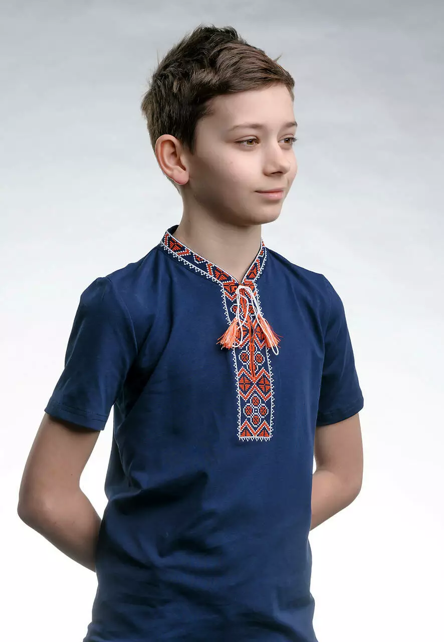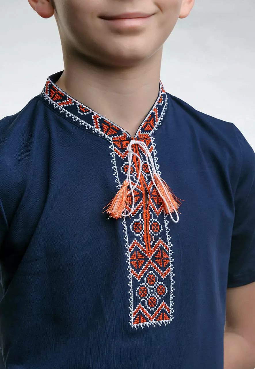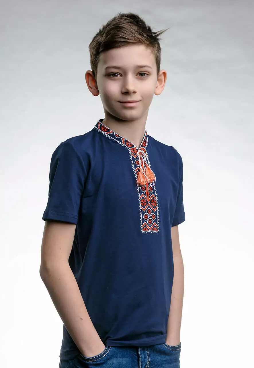 Дитяча вишита футболка на короткий рукав темно-синього кольору з червоною вишивкою бавовни, яка комфортна на дотик та освіжить у спекотні літні дні. Темно-синя вишита футболка прикрашена кутасиками та червоною вишивкою, яка символізує любов до життя, енергію, радість. Ця стильна вишиванка знадобиться у гардеробі кожного патріотика і нагадати життя вашого хлопчика тільки добрим та радісним настроєм. Завітайте у наш інтернет-магазин "Меланіка" прекрасні вишиванки для всієї сім'ї за доступними цінами.