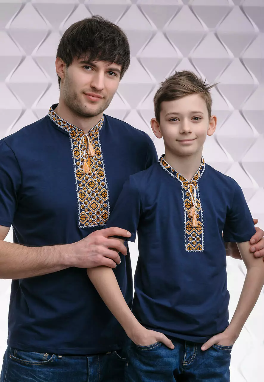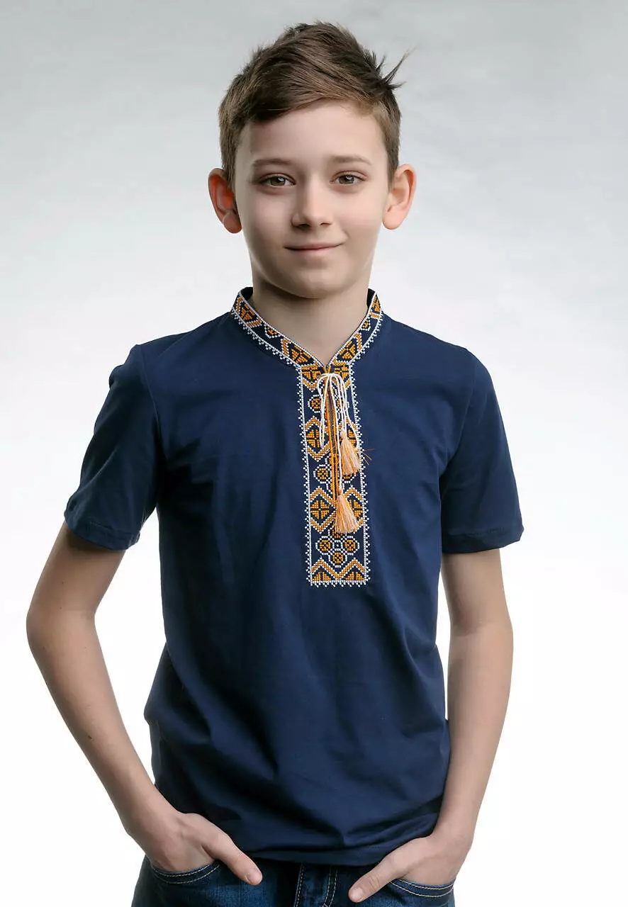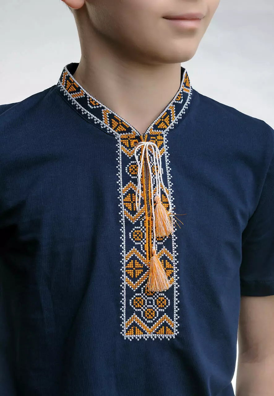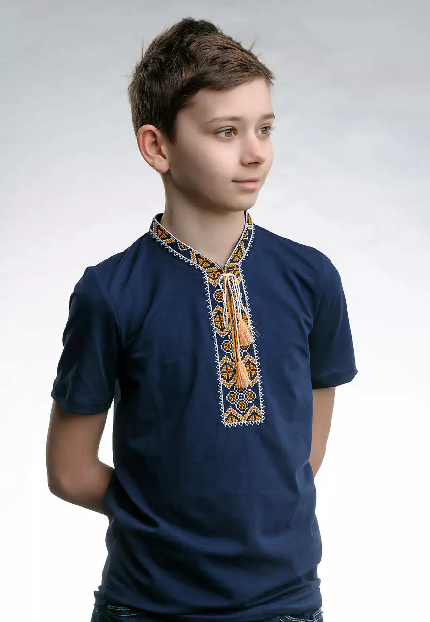 Дитяча футболка темно-синього кольору з вишивкою “ Козацька” з кутасиками для справжніх козачків! Літня футболка виготовлена з натуральної бавовни та еластану, дуже приємна та ніжна на дотик і комфортно носиться в спекотну погоду. Така прекрасна вишиванка прикрасить кожного хлопчика при будь-якій урочистості. А витончений узор на вишитій футболці є символом родючості, чоловічої мужності та впевненості. Золотий або жовтий колір є символом благополуччя, достатку, радості. Вишиванки з жовтим орнаментом допоможуть принести у ваше життя матеріальний достаток. Придбайте у нашому інтернет-магазині "Меланіка" дитячу вишиту футболку для найкращих моментів вашої дитини.