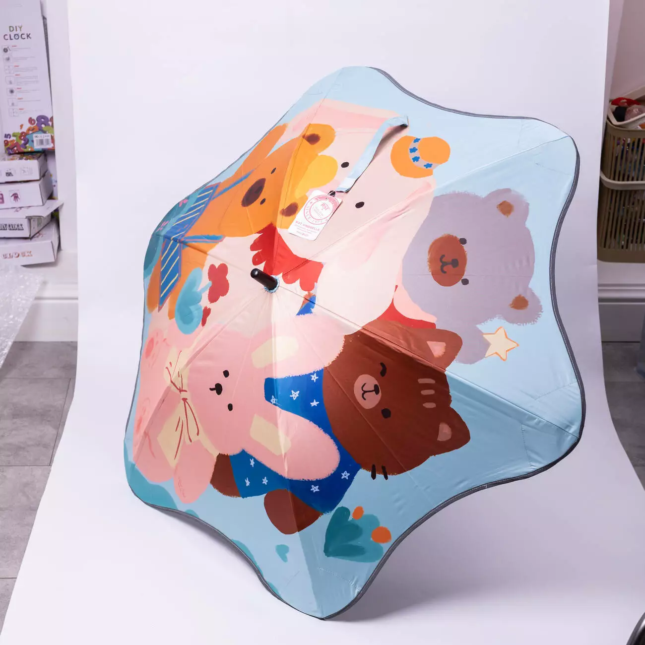 Основою парасолі є металевий стрижень, який забезпечує міцність і надійність під час користування. Ручка виготовлена з пластику, має зручну форму гака, що дозволяє дитині легко тримати парасолю в руці або підвішувати її. Конструкція зі сталевими спицями додає стійкості та допомагає утримувати купол у правильному положенні навіть під час сильного вітру.
