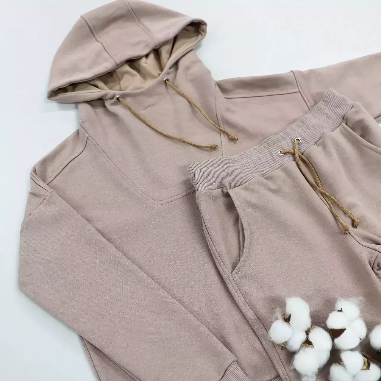 Худі костюму виконано в класичному вільному крої, прямого силуету, сидить нижче попи. Капюшон подвійний