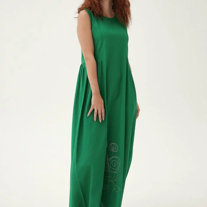 Довга сукня зі збіркою по талії з обох боків. Попереду велика