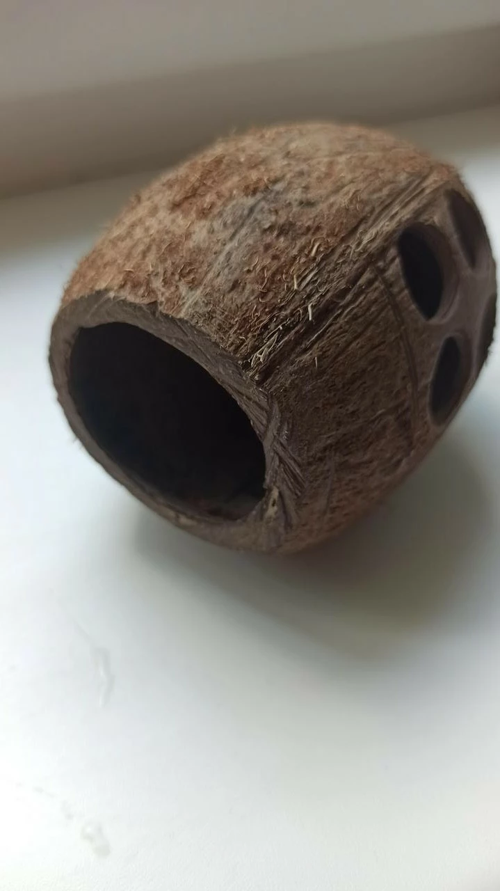 Домик для хомяка из кокоса с окошками. Экологически чистое жилище и убежище для вашего питомца.  Кроме того, внутри кокоса можно обустроить туалет для хомяка. В этом случае на дно кокоса насыпают наполнитель для кошачьих туалетов. Хомяк быстро привыкает к туалету, и уход за клеткой существенно упрощается. Наполнитель нужно менять по мере необходимости.