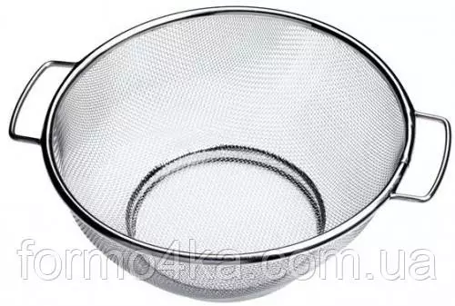Дуршлаг с металлической сеткой с двумя металлическими ручками.