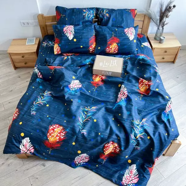 Двуспальное постельное белье LeLIT 0009 тёмно-синее с яркими оранжевыми перьями