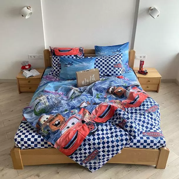 Двуспальное постельное белье LeLIT 0728 сине-голубое с красным, принт "Тачки"