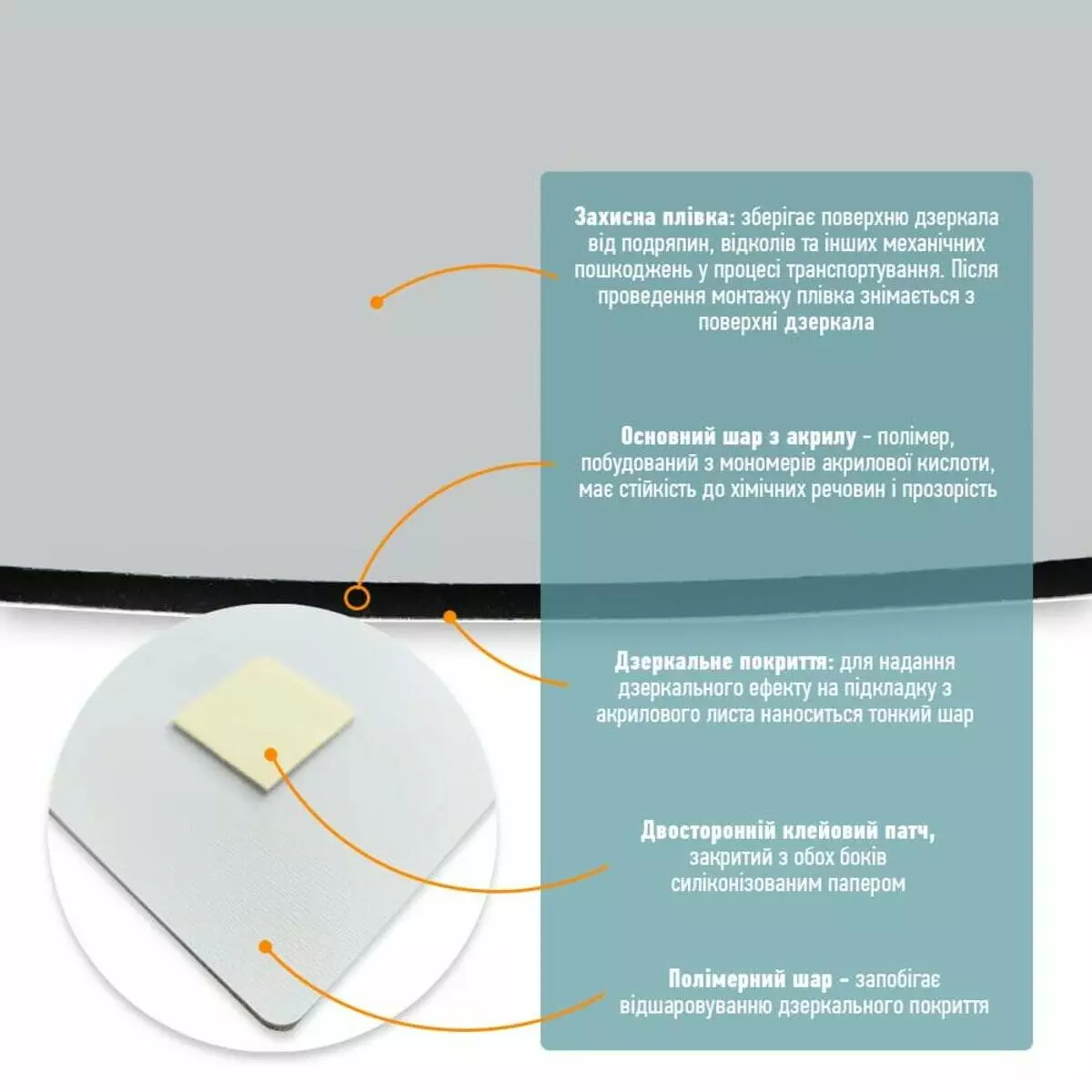 1. Захисна плівка: зберігає поверхню дзеркала від подряпин, відколів та інших механічних пошкоджень у процесі транспортування. Після проведення монтажу плівка знімається з поверхні дзеркала.