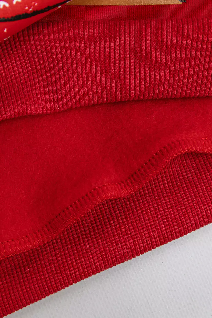 Джемпер имеет в рукавах и внизу трикотажный манжет. Нанесен новогодний принт.