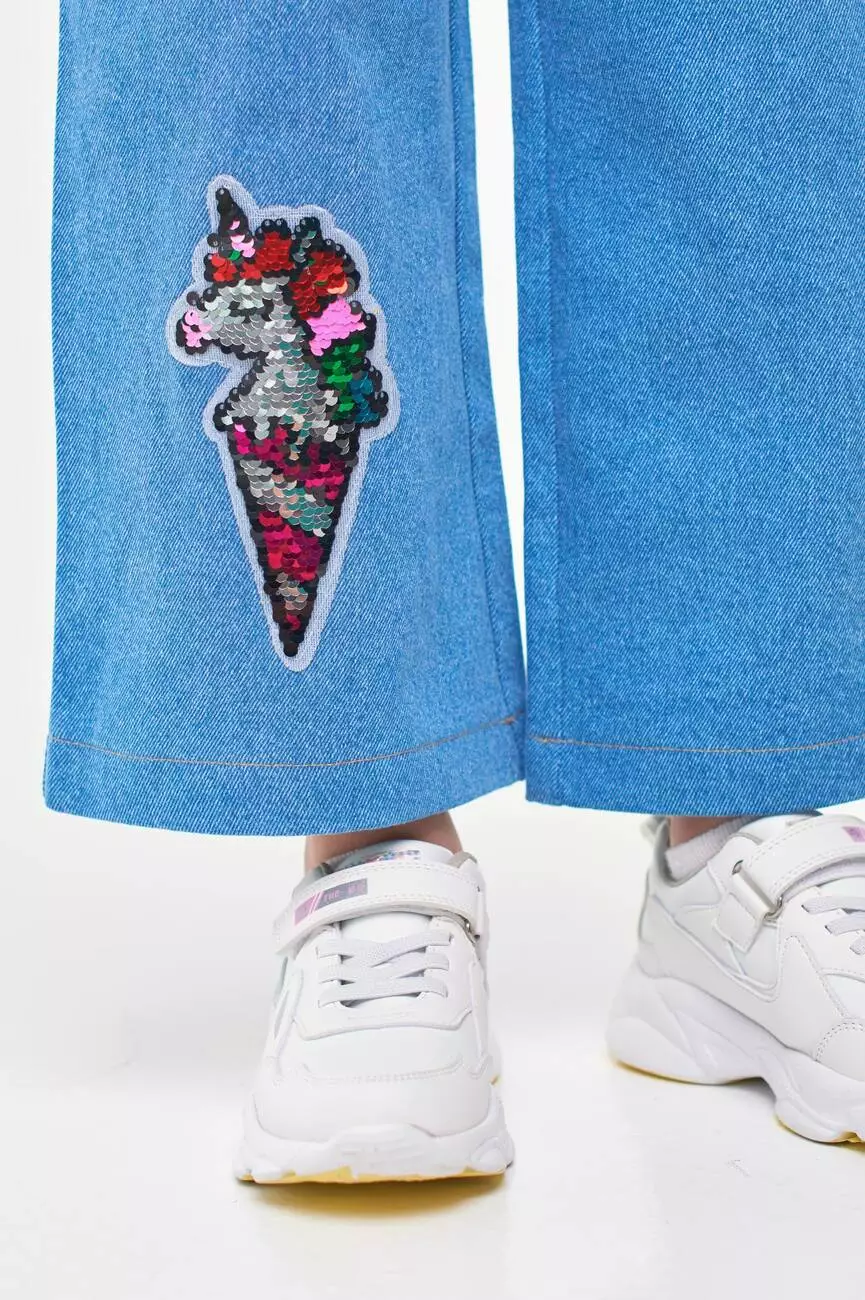 Деталі моделі: джинси світло-блакитного кольору. Середня посадка. Штанини злегка розширені до низу, з фігурними накладними кишенями по переду та аплікацією з двосторонніх паєток у вигляді Єдинорога. Середня посадка. Застібка на блискавці. В пояс по спинці вставлена резинка, на пояс нашиті шльовки. Ззаду штанів кокетка, відстрочена по шву обробною ниткою. Також, обробною ниткою відстрочені всі шви джинсів.