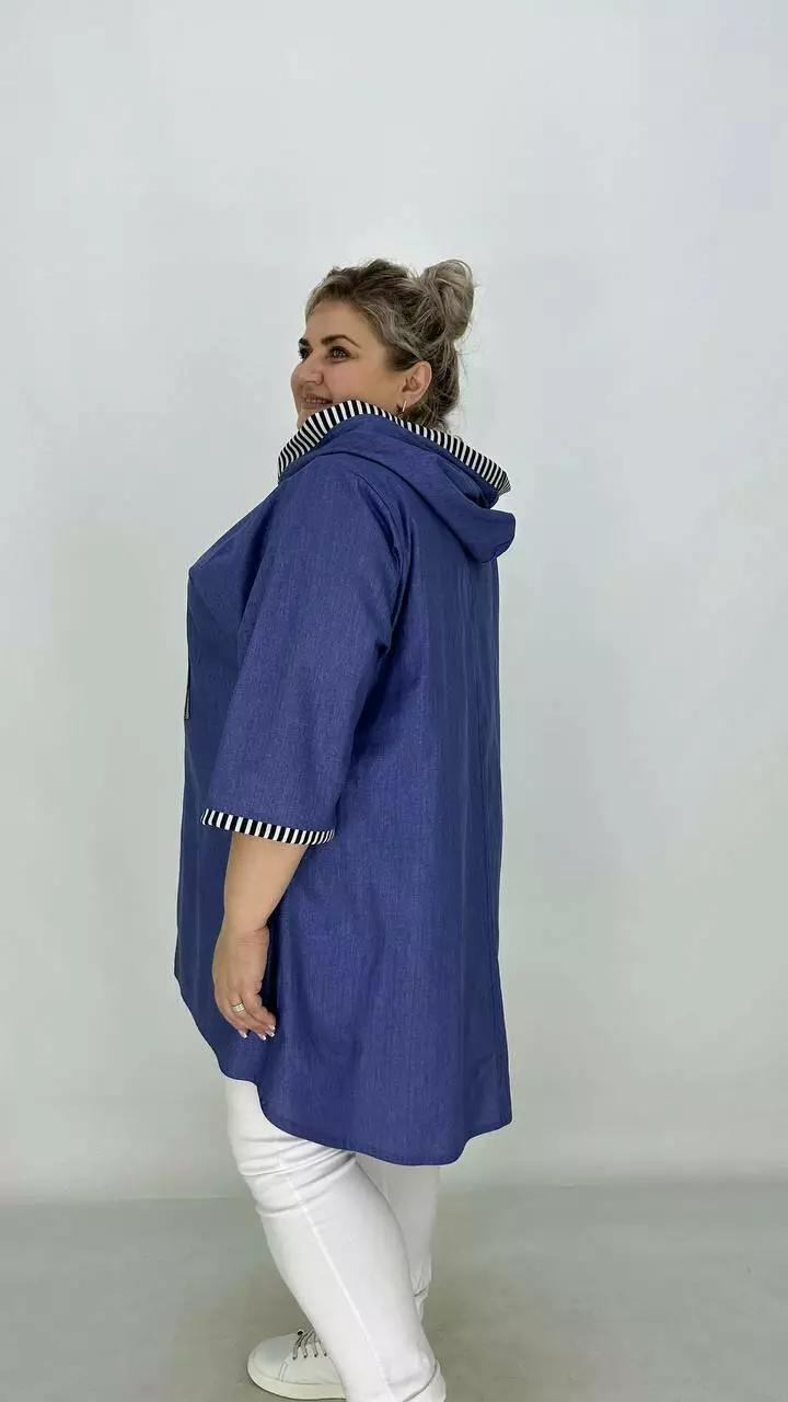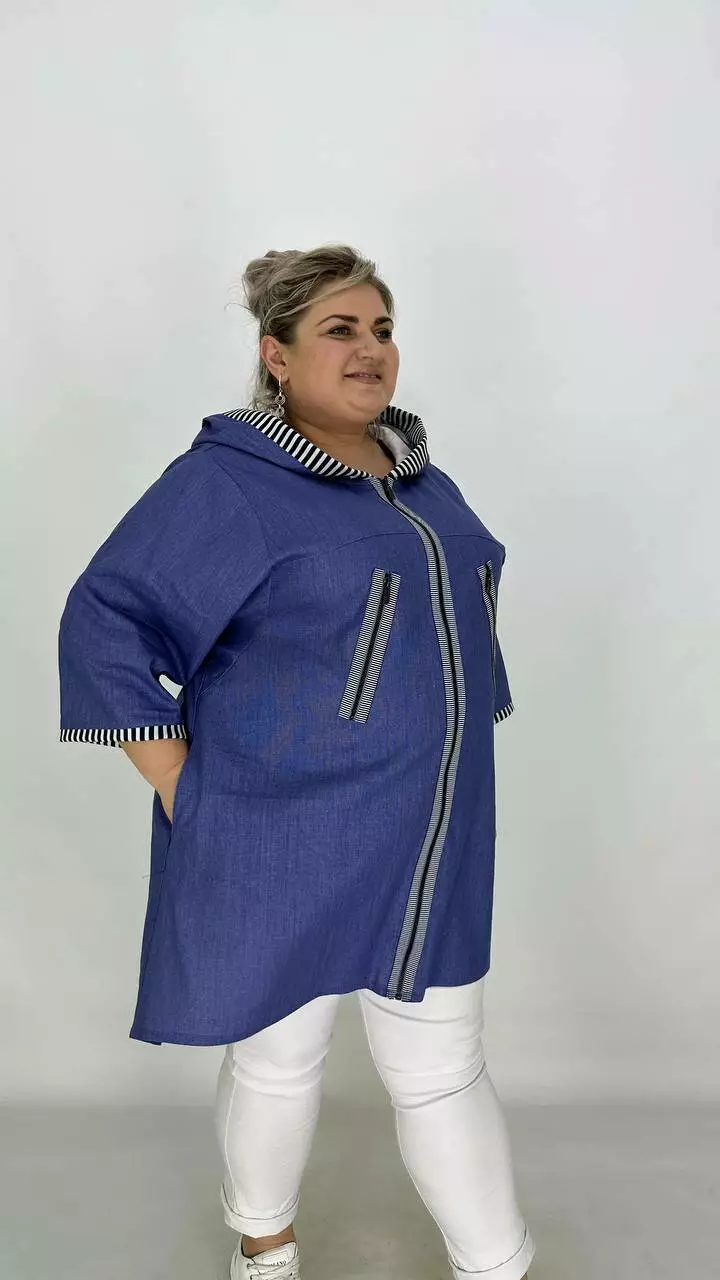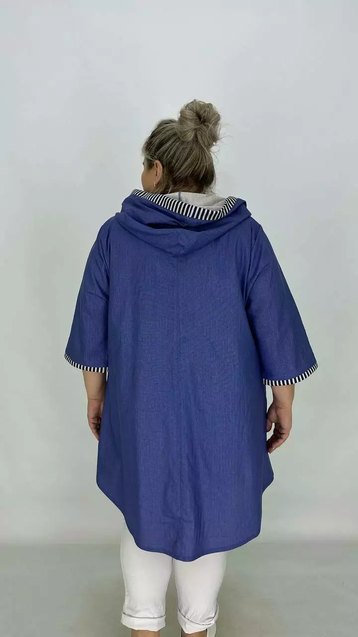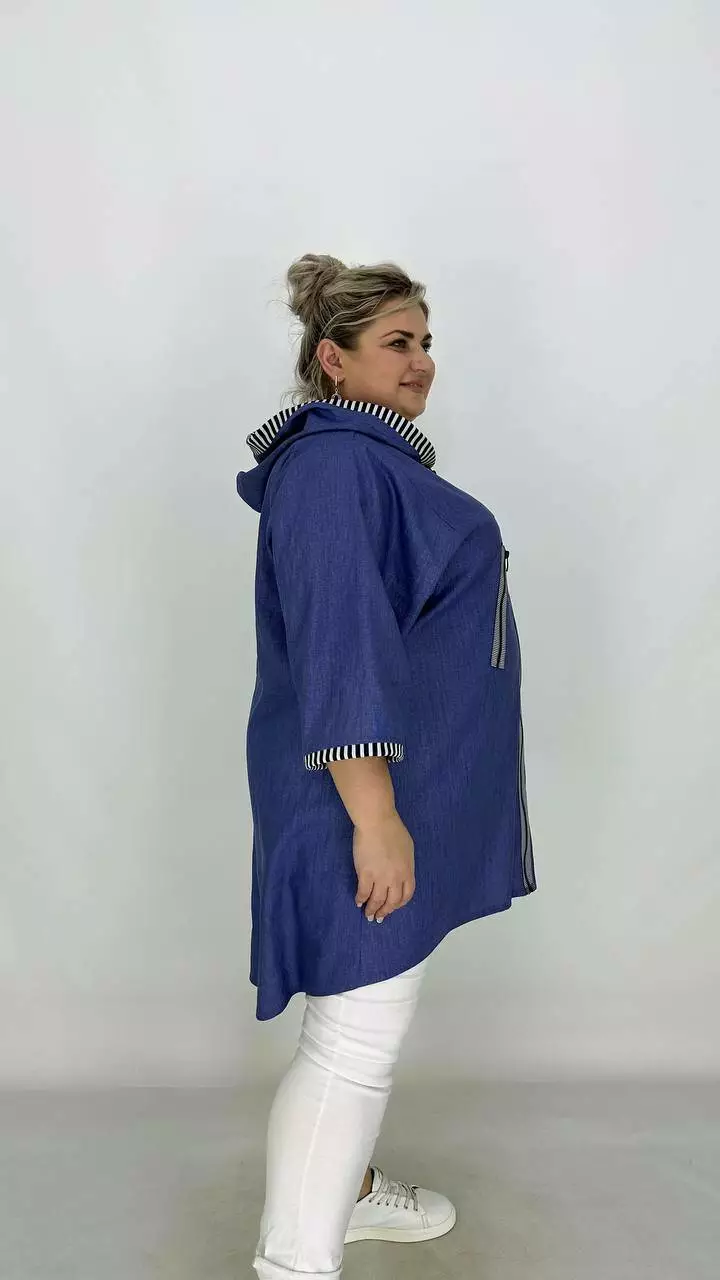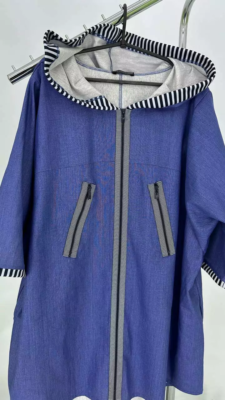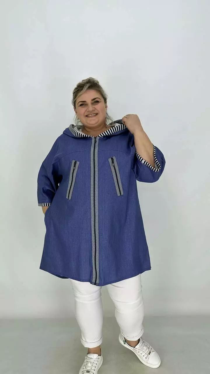 Силует трапеція, рукав вільний широкий. Вдала посадка підходить на будь-які груди. Кишені в бічних швах, подовжена спина з каптуром, застібається на змійку.