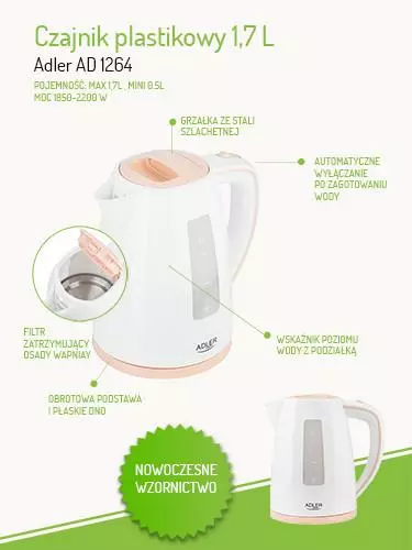 Большой, электрический семейный чайник, позволяющий быстро вскипятить воду для чая на 6-7 человек благодаря мощности 2200 Вт. Оснащенный индикатором уровня чистой воды, он автоматически выключится после кипячения. Блок также предотвратит использование пустого чайника, что позволит сэкономить энергию и защитить пользователя. Фильтр отстоя обеспечит адекватное качество воды. Для удобства он оснащен поворотным основанием, плоским дном и нагревателем из нержавеющей стали и лампой, информирующей о кипящей воде. Позволяет закипать 1,7 литра воды один раз.