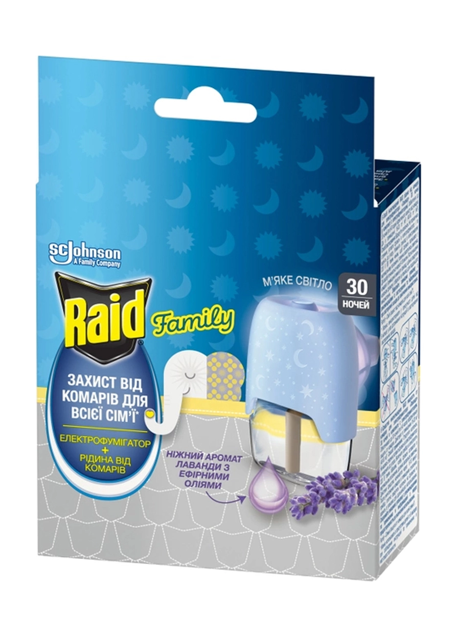 Электрофумигатор от комаров Лаванда подойдет тем, кто не хочет страдать во время сна от назойливости комаров! Средство инсектицидное RAID жидкость от комаров для электрофумигаторов "Лаванда" обеспечивает до 30 ночей (по 6-8 часов) эффективной защиты от комаров. Действует в помещении 16-20 м2 (40-50 м3). Даже с открытым окном результативно работает в течение 30 ночей при восьмичасовой работе. Действующее вещество праллетрин воздействует на нервную систему насекомых и полностью обезвреживает их.