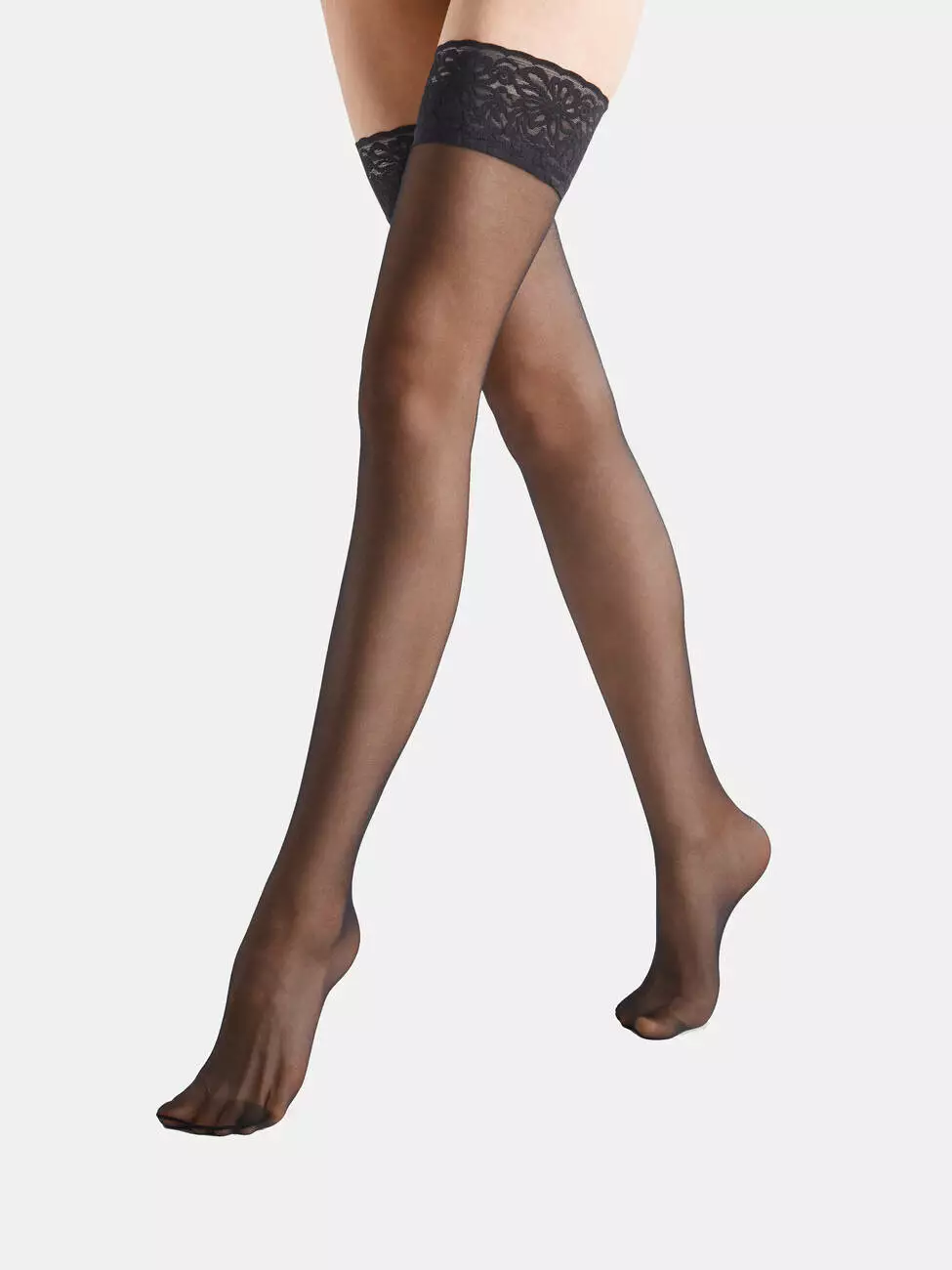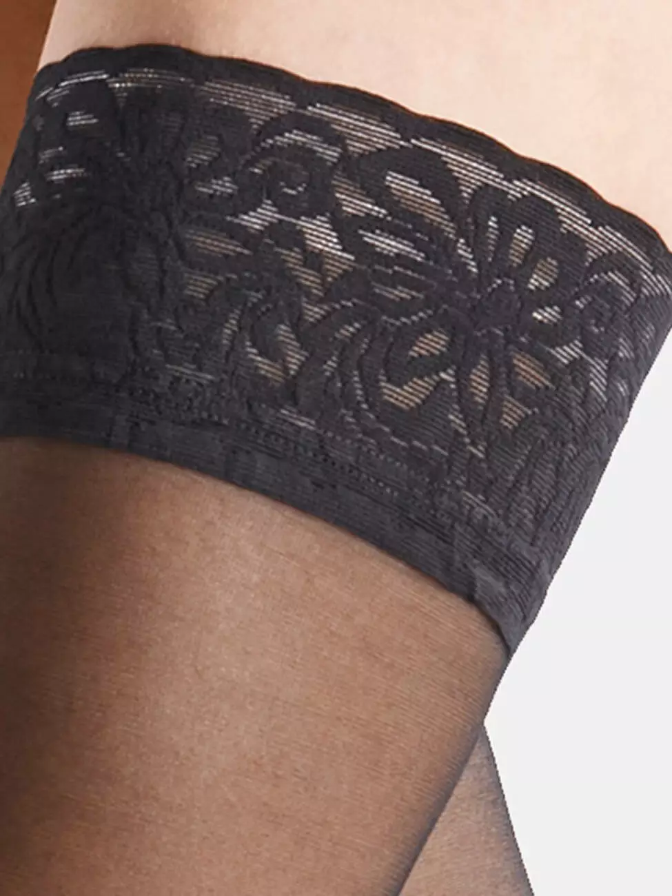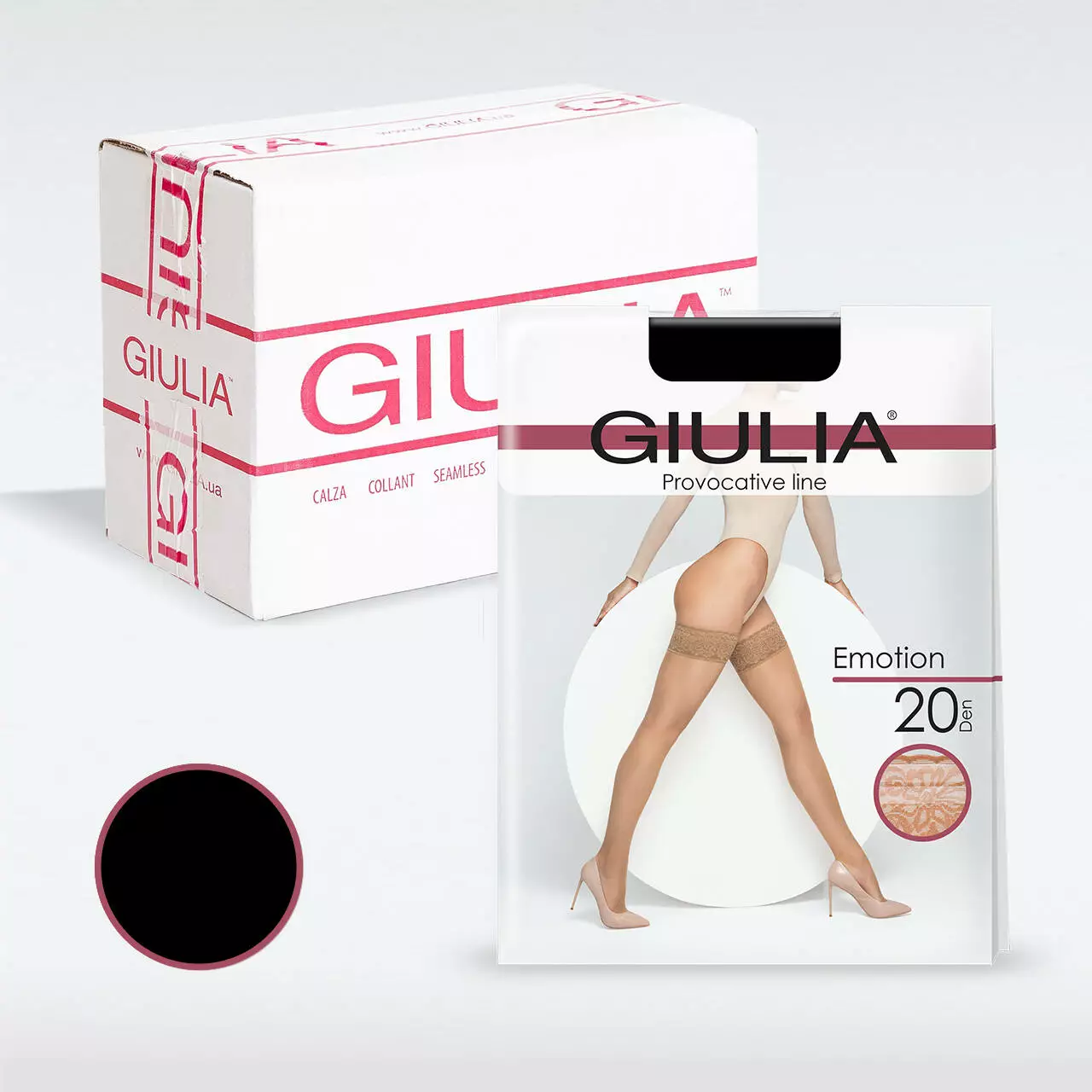 Шовковисті напівматові панчохи Giulia EMOTION 20 з елегантним самоутримувальним мереживом. Резинка прикрашена вишуканим ажурним мереживом з квітковими мотивами, що надає виробу особливий шарм. Її ширина становить 8 сантиметрів, забезпечуючи надійне утримання на нозі завдяки високоякісним силіконовим смужкам. Модель має шовковисте напівматове полотно щільністю 20 den, надзвичайно еластичне і чудово облягає ніжки, створюючи вишуканий вигляд і забезпечуючи комфорт протягом дня.