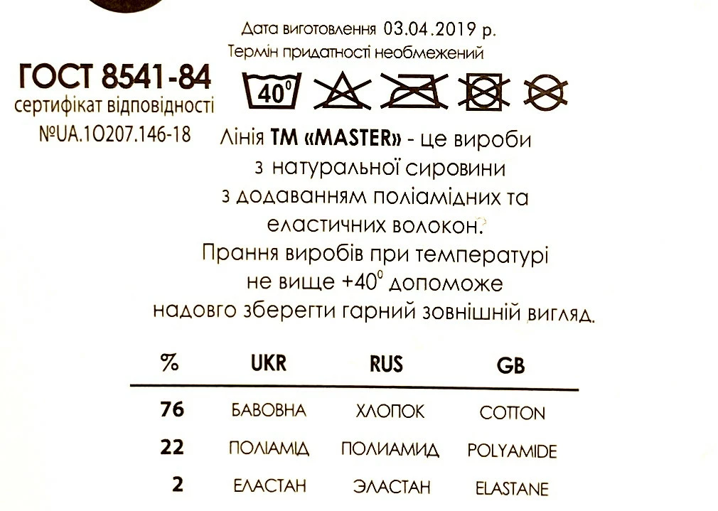 Склад: Бавовна — 76%, поліамід — 22%, еластан — 2%.