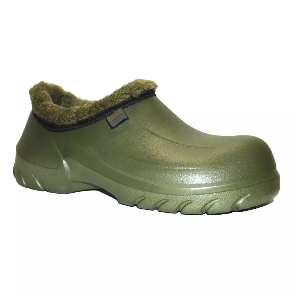 Чоловічі НАПІВОБШИТІ утеплені калоші - взуття на прохолодну дощову погоду і сльоту в осінньо-зимовий період. Калоші суцільнолиті, виготовлені з сучасного полімеру ЕВА. Край взуття обшитий штучним хутром, всередині знімна двошарова хутряна/повстяна устілка.