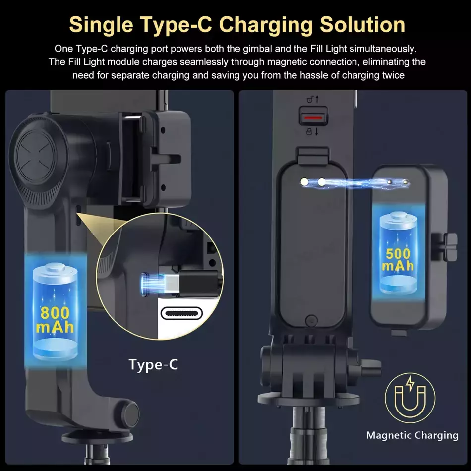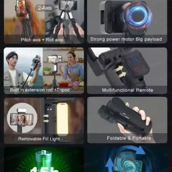 Знімайте контент професійного рівня на ходу за допомогою 2-осьового стабілізатора A10 зі світлодіодним підсвічуванням. Розроблений для творців відео, влогерів та користувачів соціальних мереж, цей компактний універсальний пристрій поєднує в собі селфі-палицю, штатив, підсвічування та освітлення. Завдяки плавній стабілізації, розширюваному радіусу дії та вбудованому освітленню, він гарантує, що ваші відео та фотографії завжди будуть чіткими, яскравими та без тремтіння — без потреби в додатках.