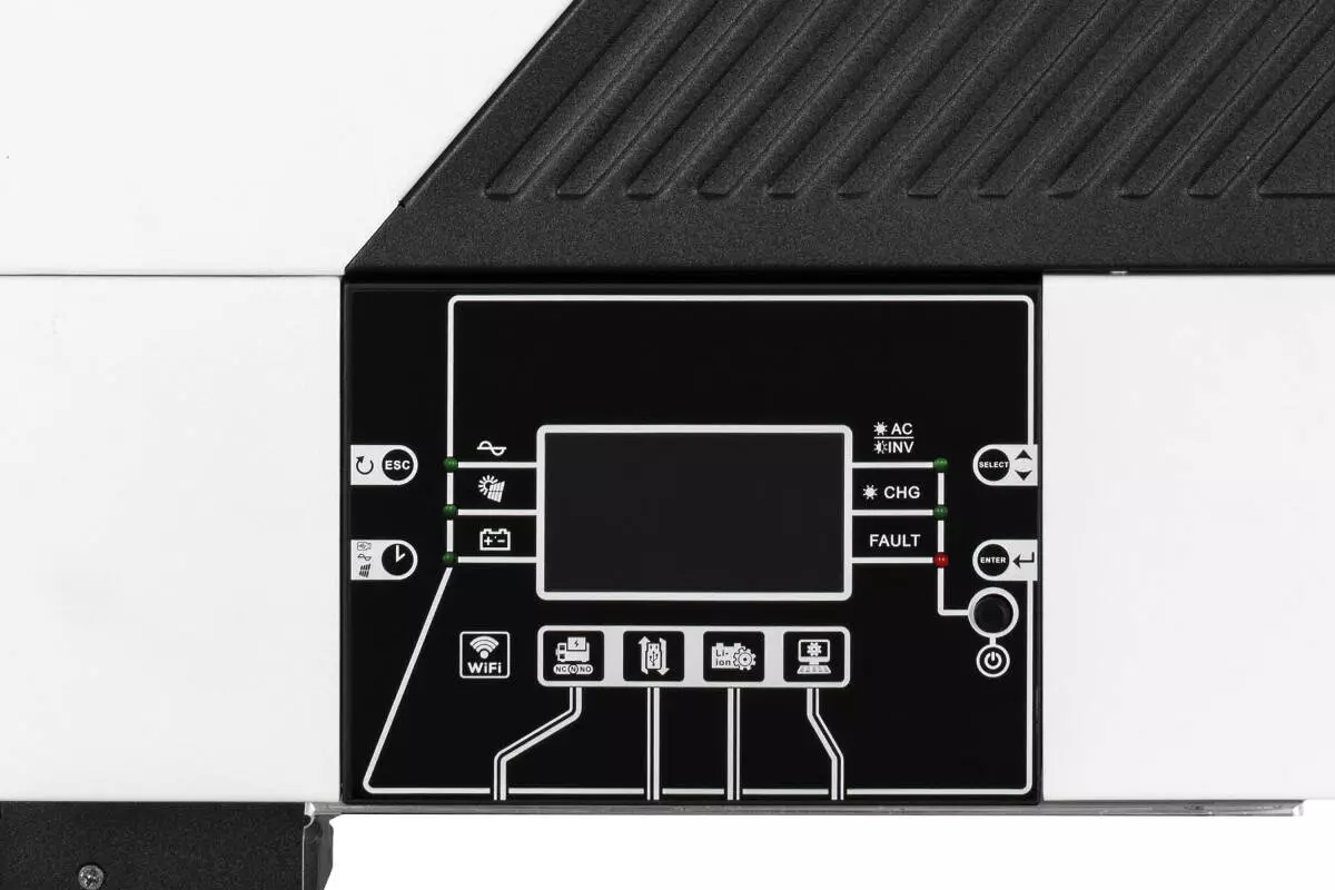 Розв’язати складні й енергоємні завдання допоможе інвертор SM-6K248T потужністю 6,2 кВт (6 200 ВА). Автономний пристрій має і мережевий, і сонячний контролер (високовольтний МРРТ), що дає змогу легко підключати фотоелектричний масив (сонячні панелі) максимальною потужністю до 6 000 Вт (1 × 27 A). Вікно МРРТ: 60-450 В постійного струму. Крім того, у разі потреби до інвертора також можна додатково під’єднувати батареї різних типів 48 В, при цьому максимальний струм ЗП становитиме 120 А (комбінований). Загалом щодо можливостей застосування, то потужності інвертора вистачить, аби заживити основні системи (опалення, водопостачання, кондиціонування), наприклад, котеджу або підприємства до 150 м².