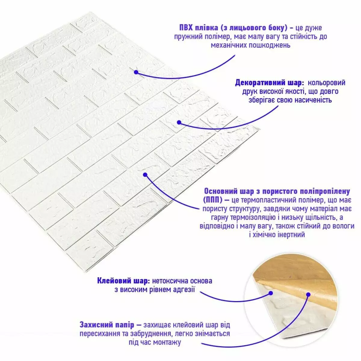 3D панелі самоклеючі – декоративне покриття для стін, виконане з легкого та міцного матеріалу – пористого поліпропілену (ППП). Основна особливість – рельєфний малюнок у вигляді цегли у широкому різноманітті кольорів та наявність клейового шару, що дозволяє встановити панелі без необхідності застосування додаткових матеріалів.