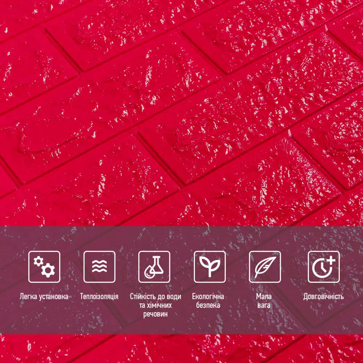 3D панелі самоклеючі – декоративне покриття для стін, виконане з легкого та міцного матеріалу – пористого поліпропілену (ППП). Основна особливість – рельєфний малюнок у вигляді цегли у широкому різноманітті кольорів та наявність клейового шару, що дозволяє встановити панелі без необхідності застосування додаткових матеріалів.