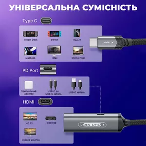 Адаптер USB-C на HDMI 4K@60Hz та USB-C PD JSAUX HB0201 - это универсальный адаптер USB-C 2 в 1, который оптимизирует ваше подключение. Он оснащен выходом порта HDMI 4K и портом зарядки USB-C, которые можно использовать одновременно.