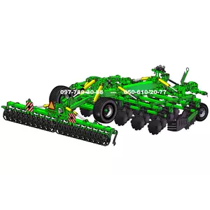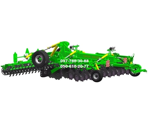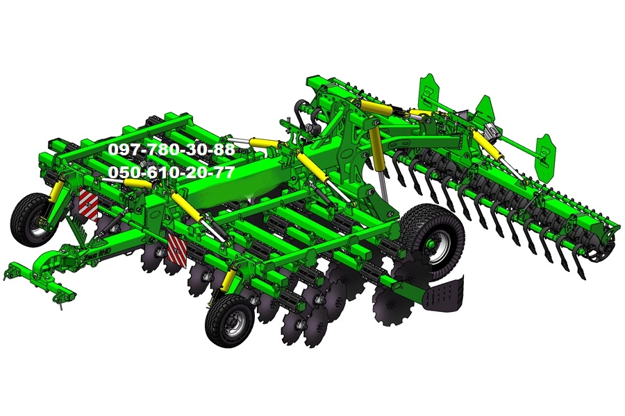 На рабочей стойке закреплены два тандемных необслуживаемых рабочих органа в шахматном порядке, а их разнесение в четыре ряда, способствует свободному перемешиванию почвы, без забивания агрегата, а самоочищающийся каток с вибрирующими пластинами, идеально выравнивает поверхность поля после прохождения дисков.