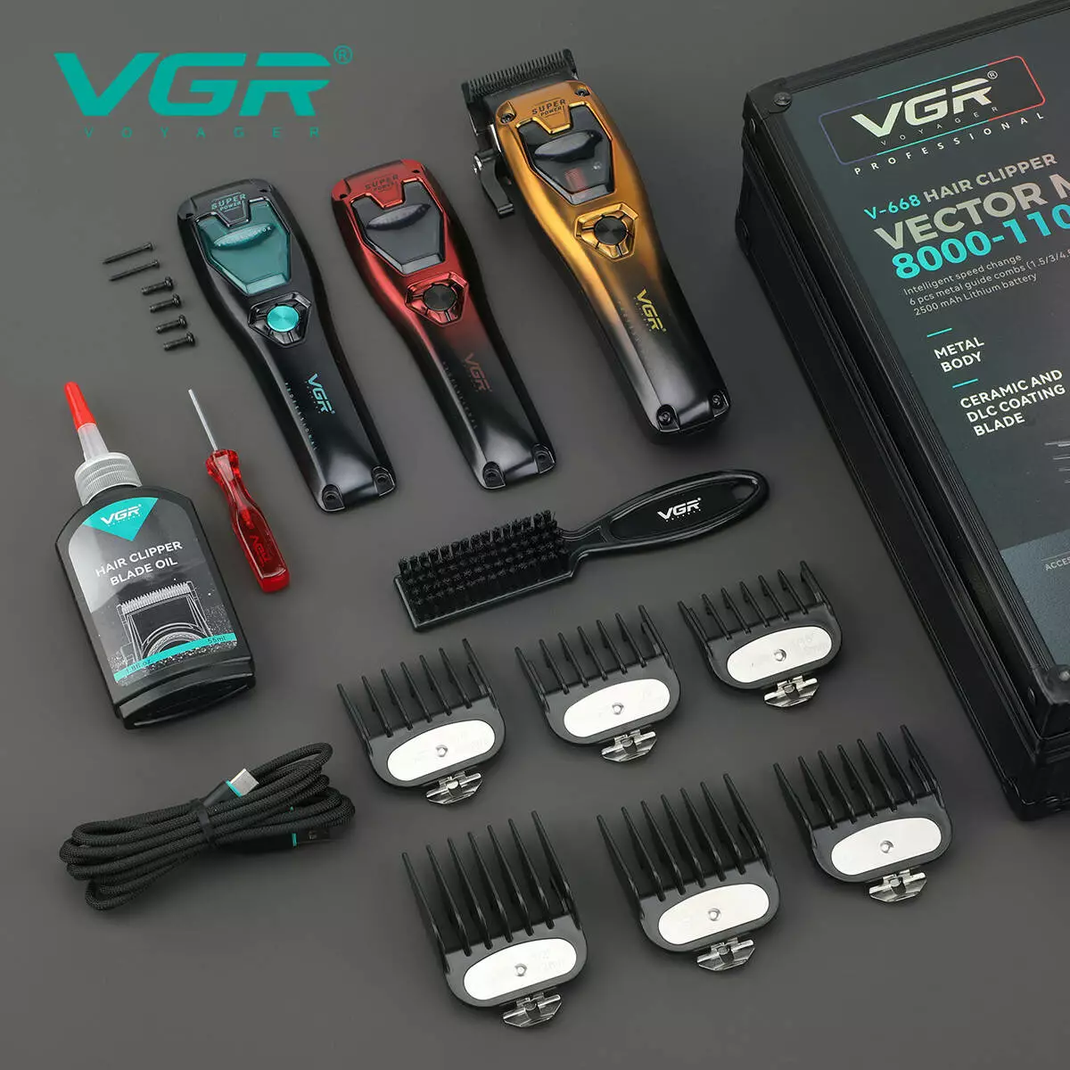 Акумуляторна машинка для стрижки (clipper) VGR V-668, VECTOR MOTOR 8000-11000 RPM, 6 насадок, LED display