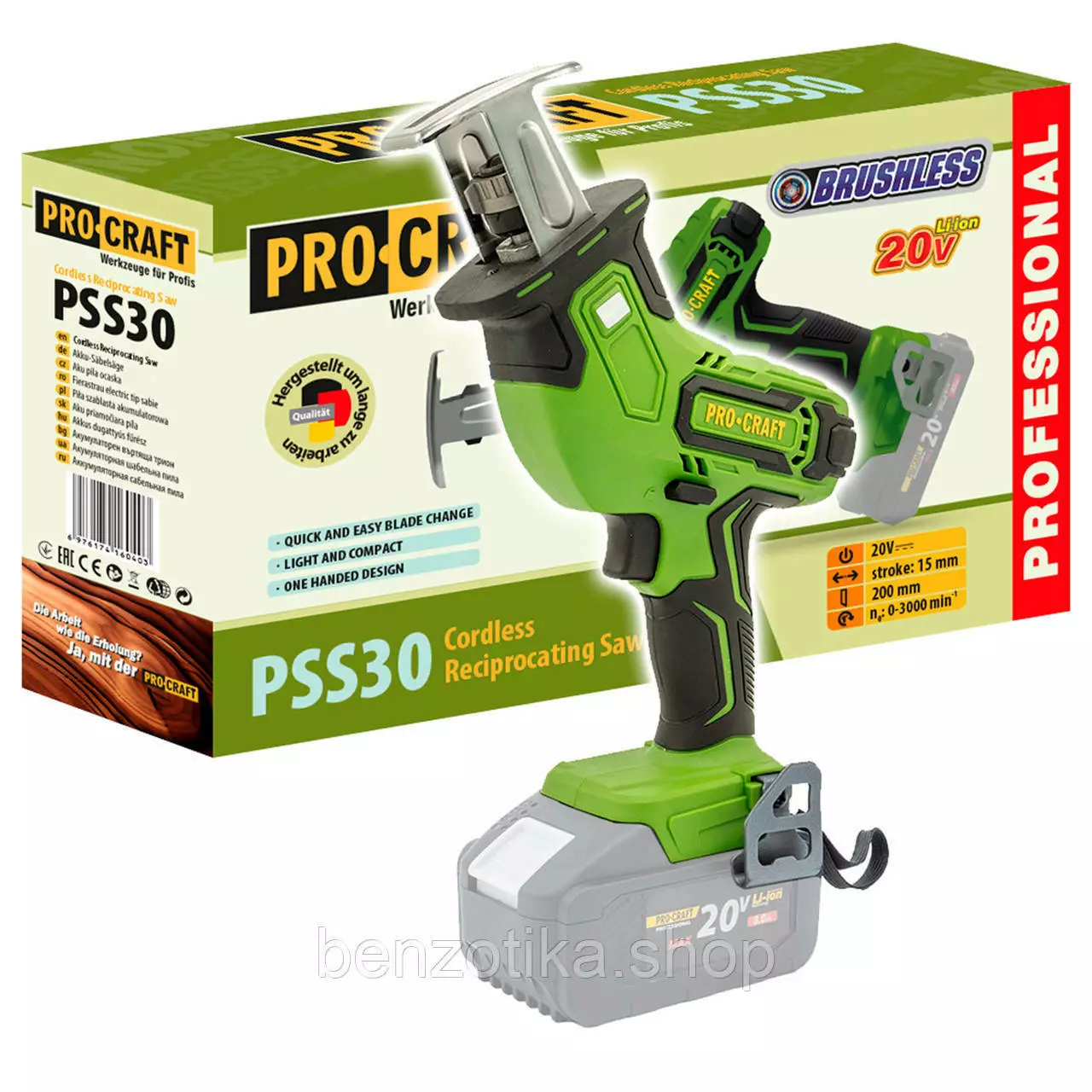 пила Procraft PSS30 работает от напряжения 20 В, что обеспечивает