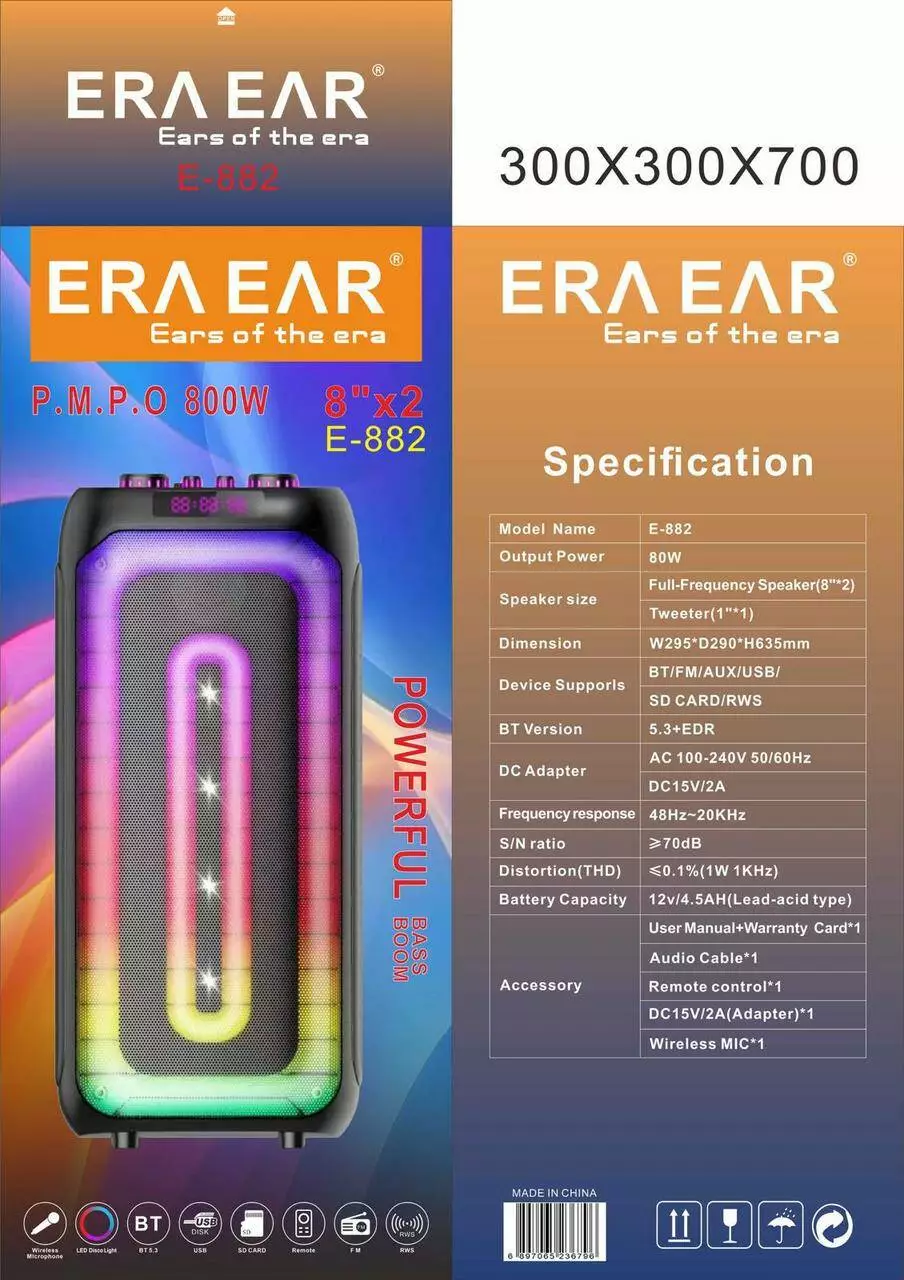 Акустична переносна колонка ERA EAR E-882/9652 80Вт 2x8" TWS/FM/USB/TF/BT/REC/LED/1MIC/ДК (1)