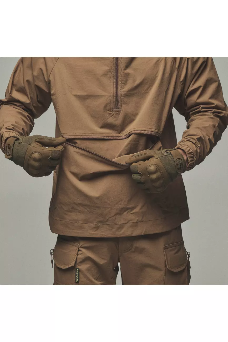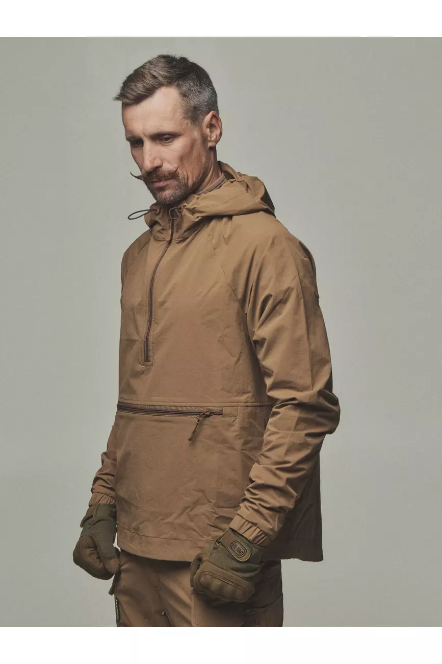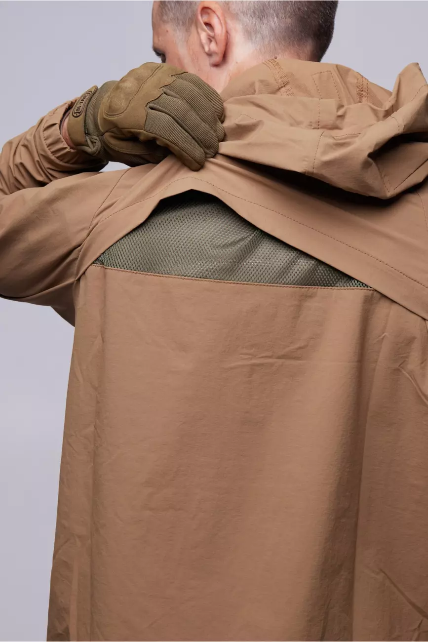 Анорак розтягується та не сковує рухи, не пропускає вологу та одночасно дихає. Має велику кишеню на змійці, капюшон з регулюванням розміру, на манжеті гумка для щільного прилягання та провітрювані кишені з сіткою під пахвами якщо треба знизити температуру після навантаження. Якісна фурнітура та тканина рівня ТОП робить цей виріб унікальним при використані та майже не має аналогів!