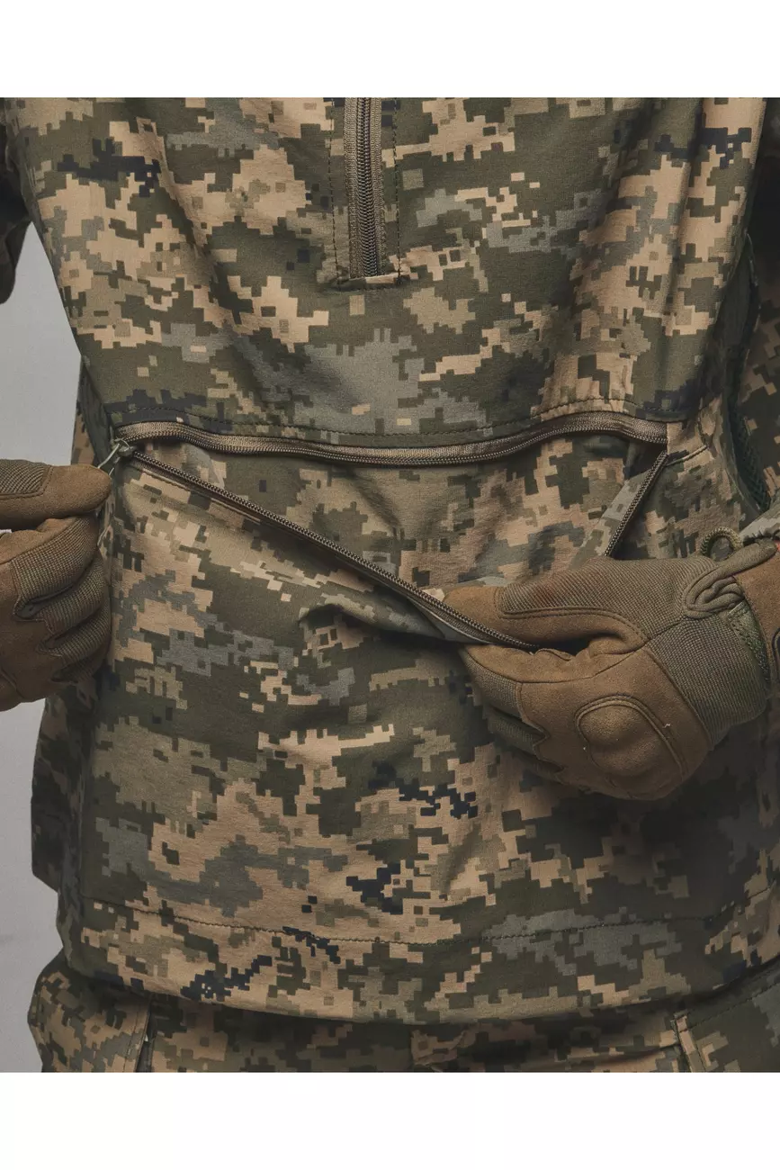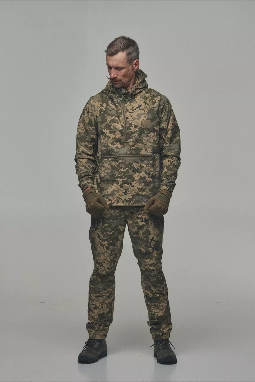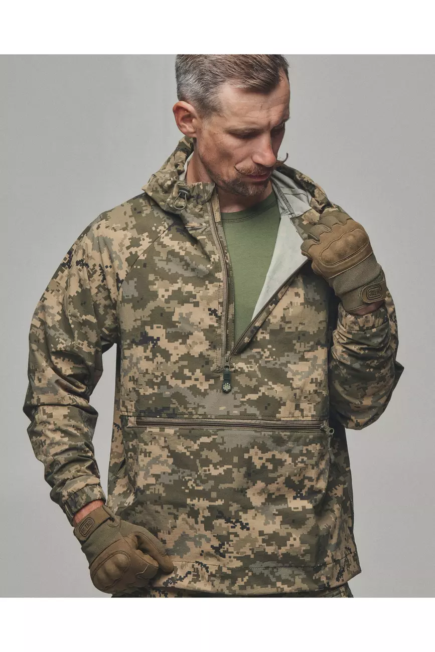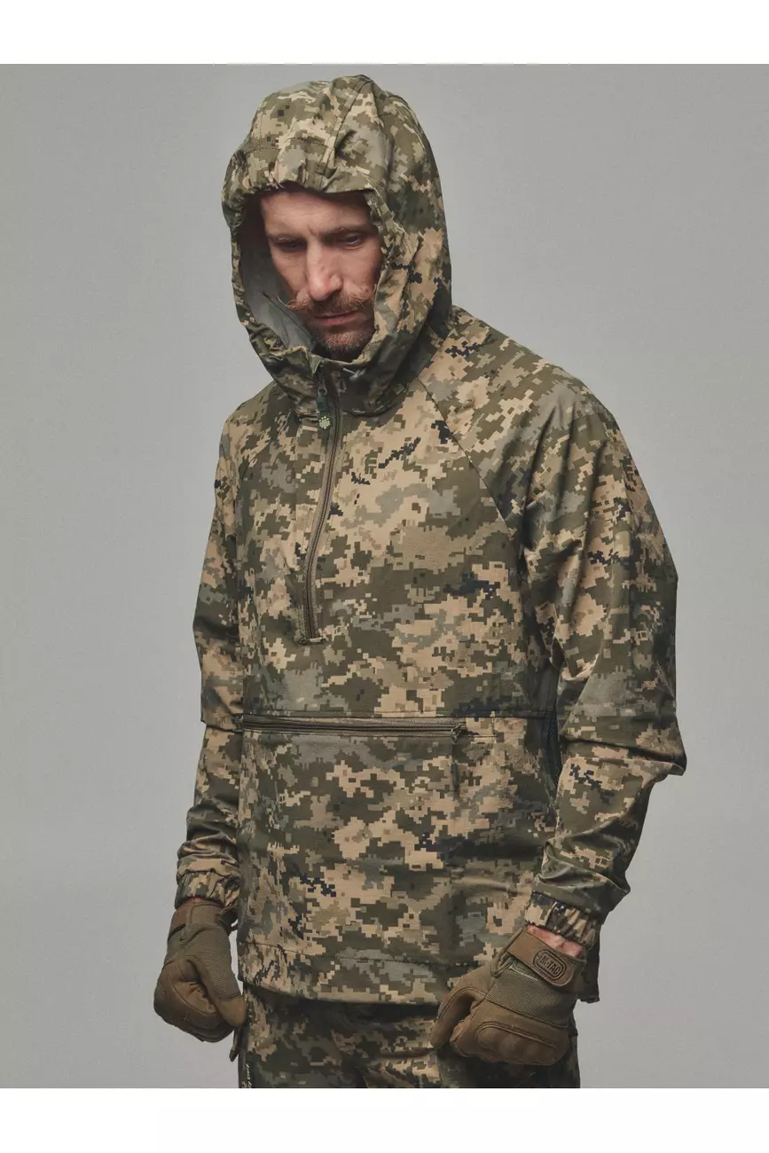 Анорак розтягується та не сковує рухи, не пропускає вологу та одночасно дихає. Має велику кишеню на змійці, капюшон з регулюванням розміру, на манжеті гумка для щільного прилягання та провітрювані кишені з сіткою під пахвами якщо треба знизити температуру після навантаження. Якісна фурнітура та тканина рівня ТОП робить цей виріб унікальним при використані та майже не має аналогів!