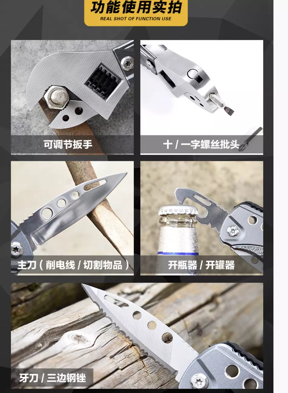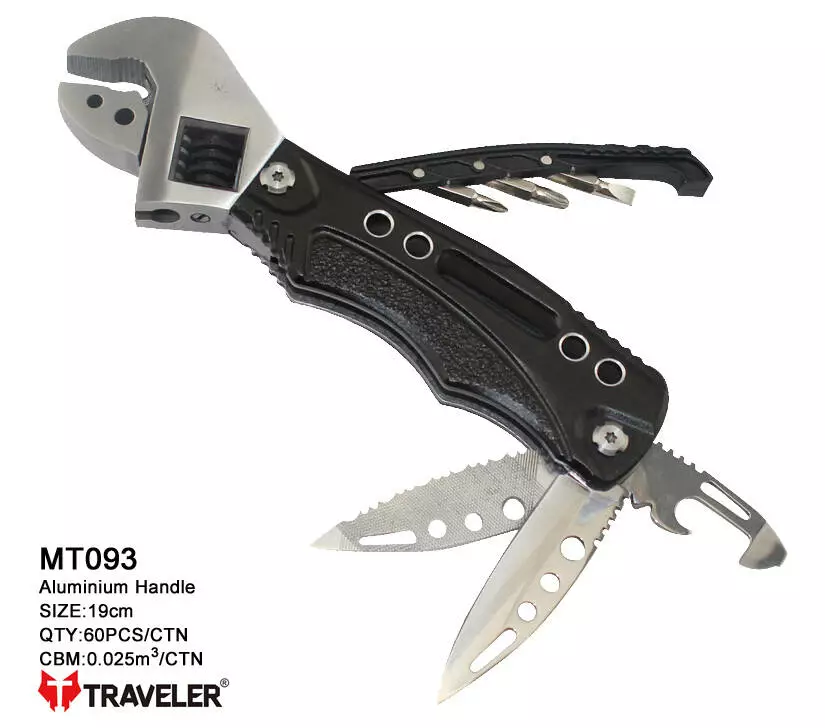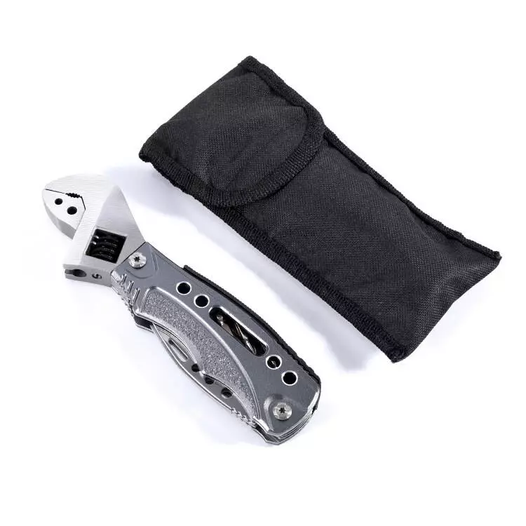 Многофункциональный инструмент Traveller Premium из нержавеющей стали: разводной ключ, отвертка со сменными насадками (3 насадки — 2 крестообразных, 1 плоская), лезвие, ножовка, консервный нож и открывалка для бутылок.