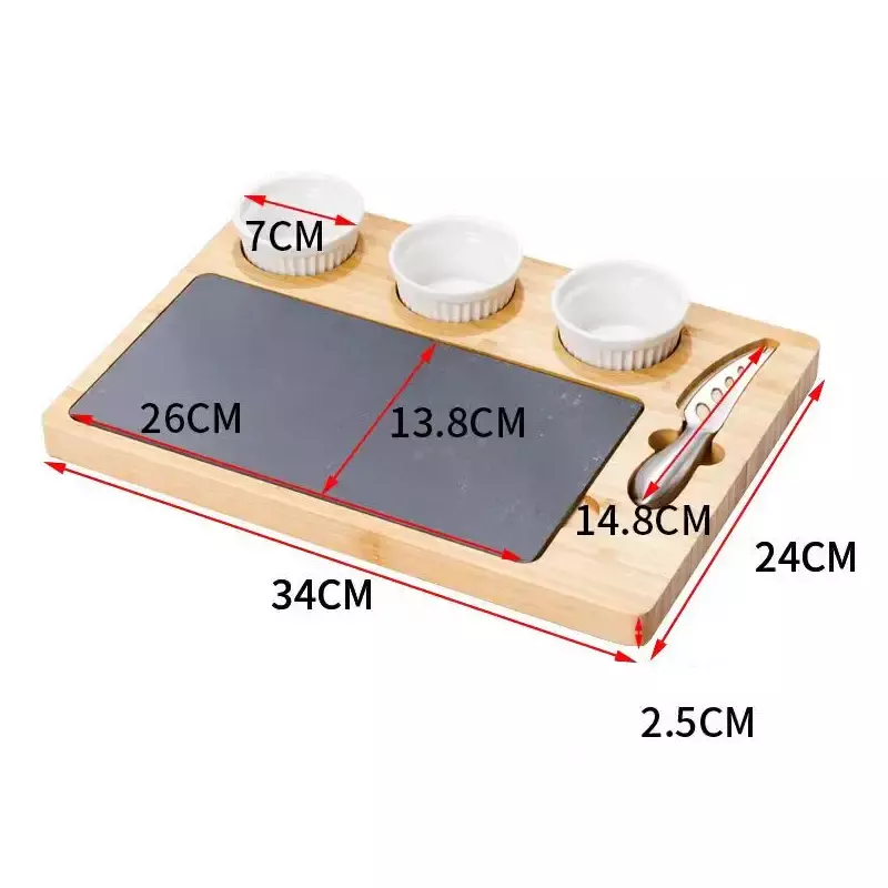 Комплектація: дошка, ніж для сиру, 3 керамічних соусники