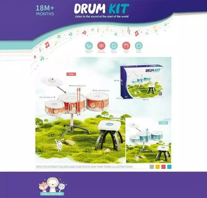 Барабанна установка 3903 E (12) 2 кольори, стільчик, 3 барабани, 2 палички, 1 металевий диск, в коробці