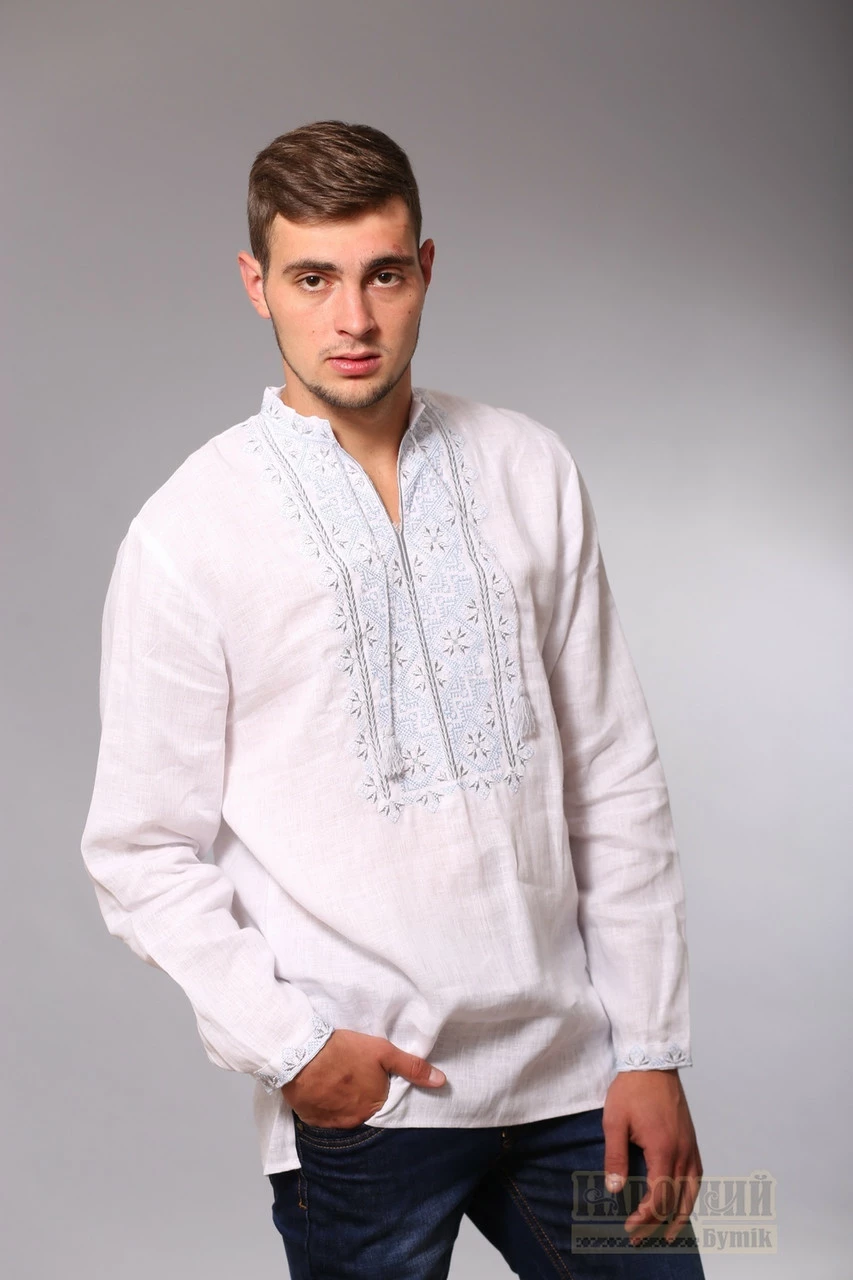 Вышиванка мужская белый лен, голубая вышивка